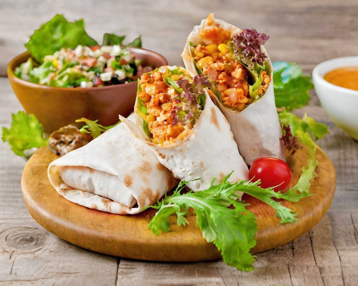 Tortilla de burro con arroz, frijoles, lechuga, cebolla, jitomate, nopales y pechuga rellena. Acompañado de papas fritas y salsas.