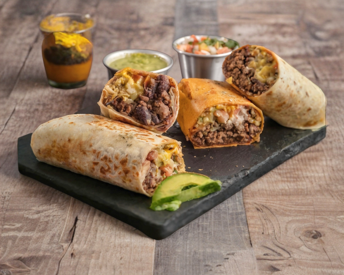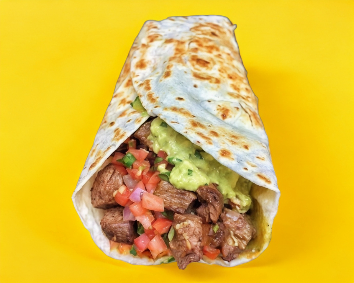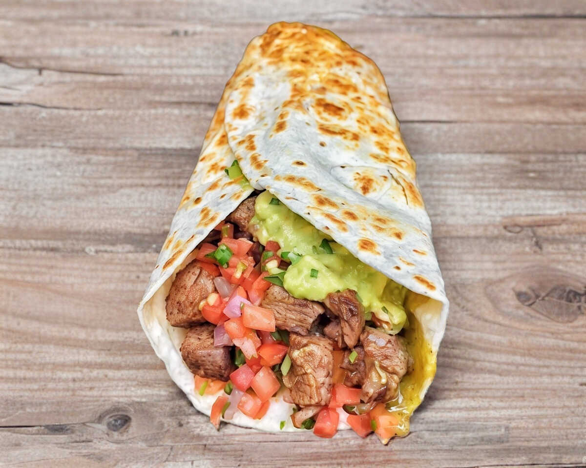 Tortilla de harina de 20 cm con arrachera, arroz blanco, frijoles, tocino, queso manchego, lechuga, jitomate, cebolla, aguacate y aderezo de chipotle. Acompañado de papas fritas (270 g).