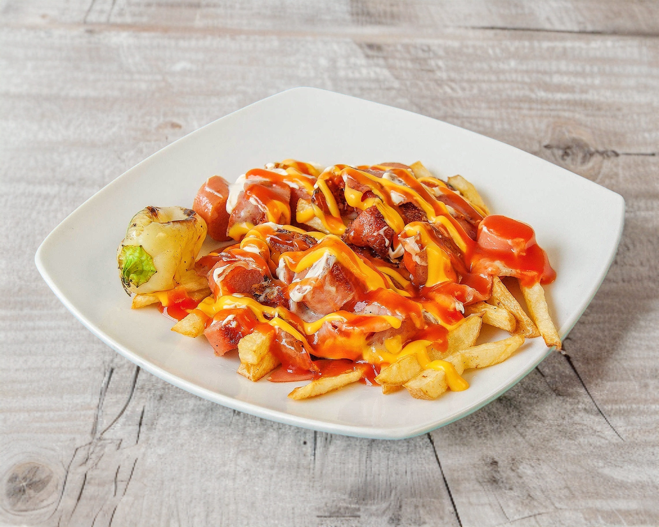 Ración de 150 g de papas a la francesa combinadas con salchichas, salsa de queso, mayonesa y queso blanco.