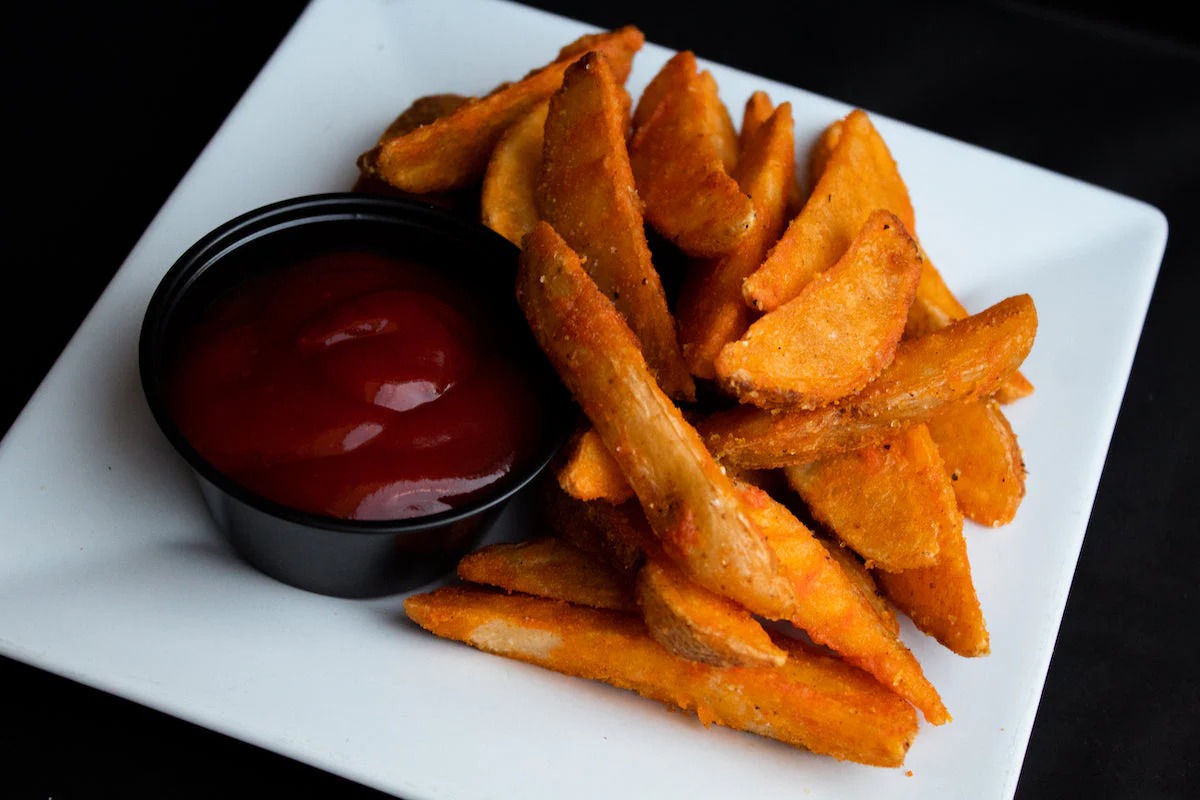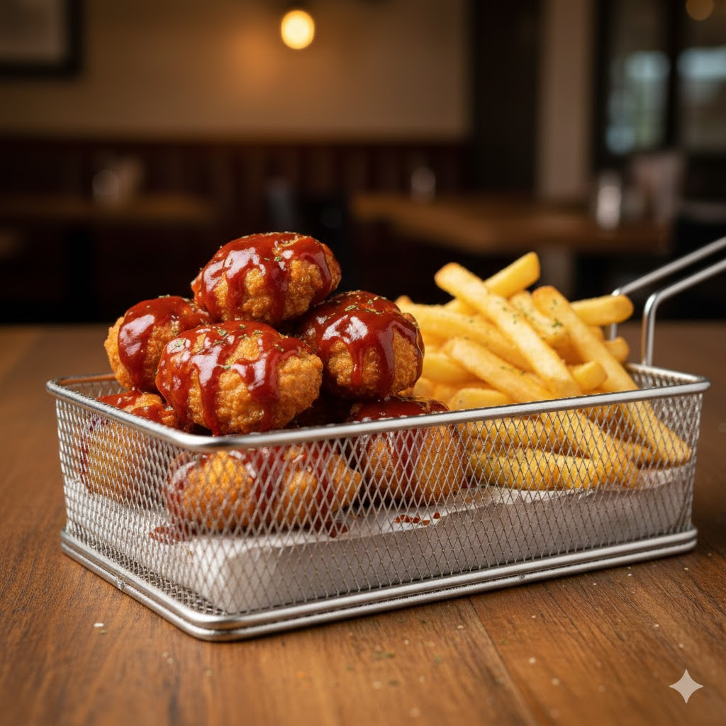 250gr de trozos de pechuga de pollo empanizados bañados en salsa a elegir acompañados de papas a elegir