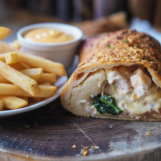 Rollo de pollo horneado, relleno de pechuga de pollo, queso mozarella, tocino ahumado, aderezo cesar, cebolla, acompañado de papas a elegir y salsa de la casa.
