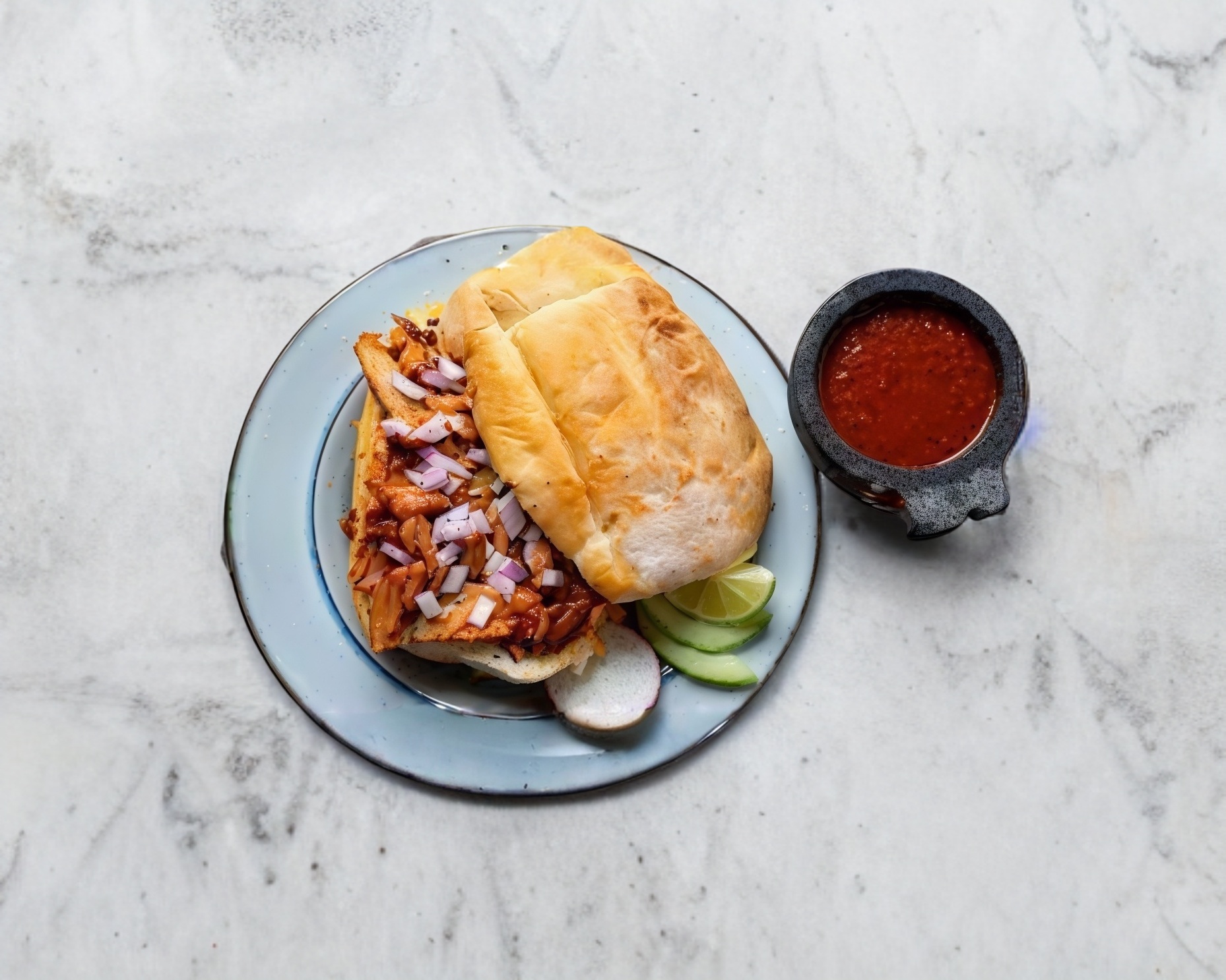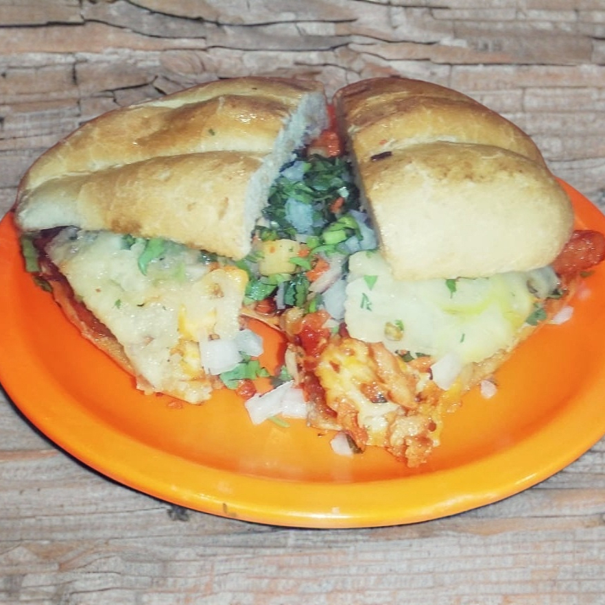 Torta en pan telera, rellena de carne al pastor, piña, queso Oaxaca, cilantro y cebolla.