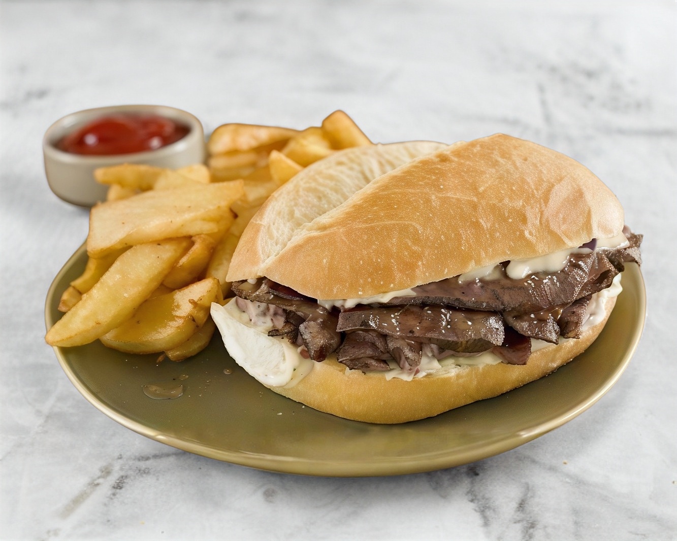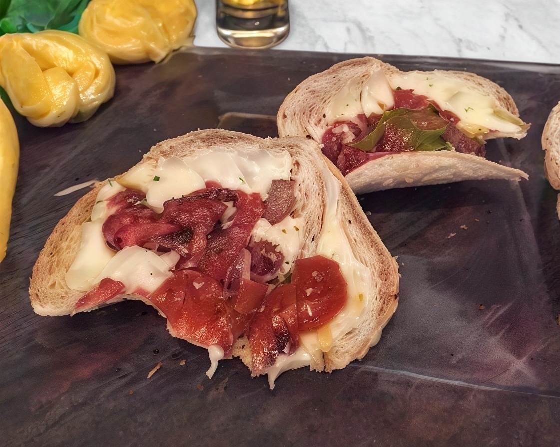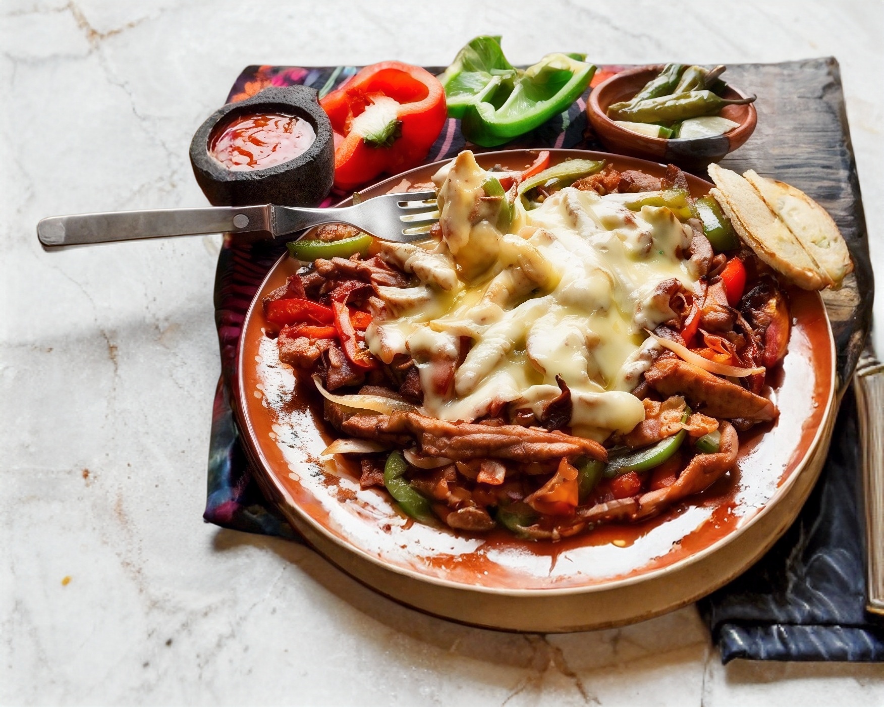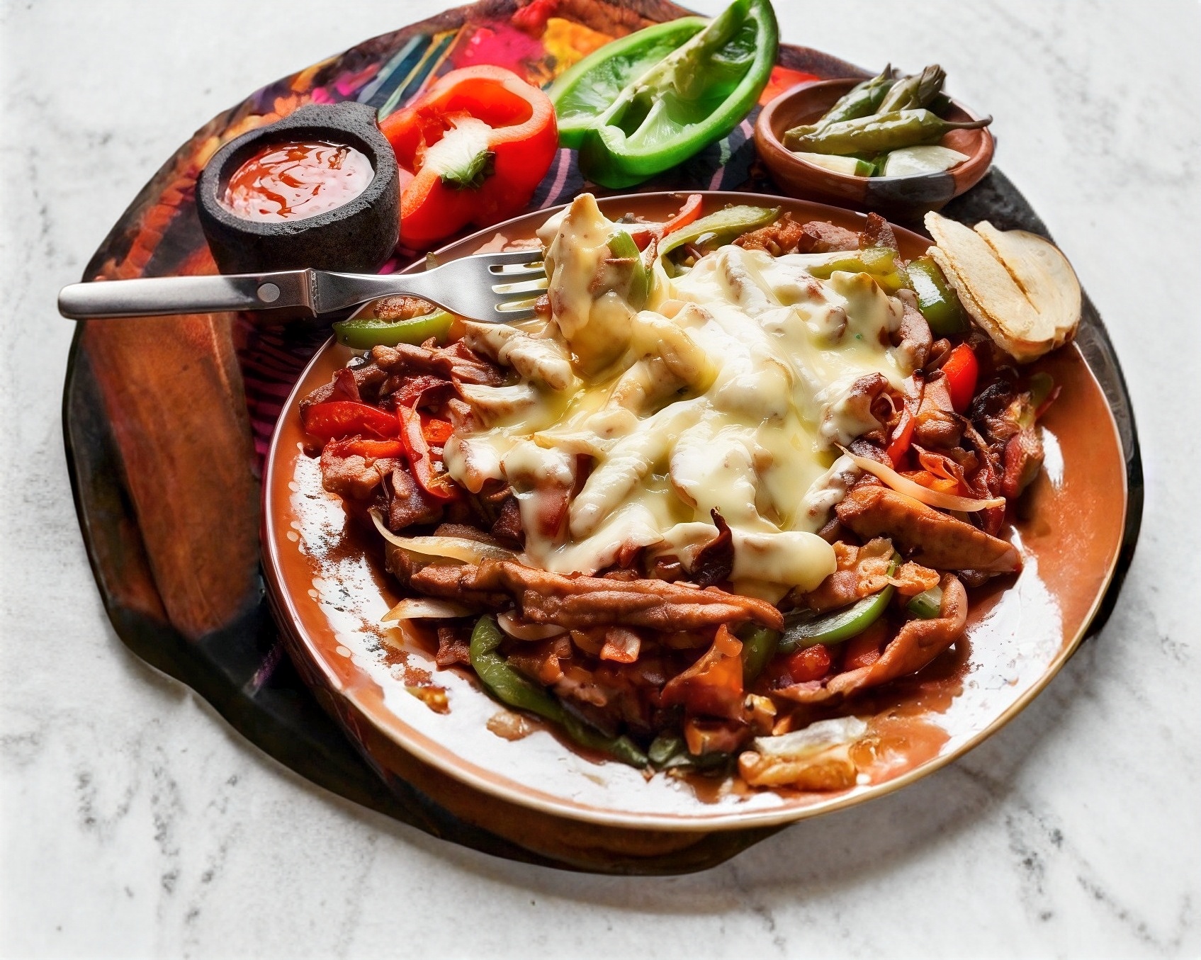 Bistec de res (300 gramos aprox), morrón, cebolla, tocino y queso Oaxaca.