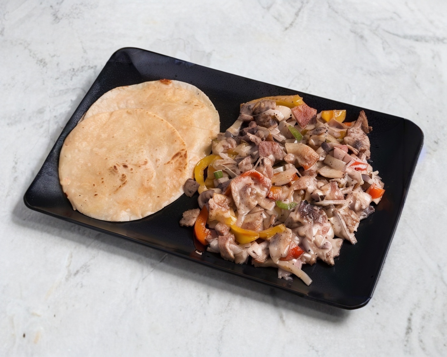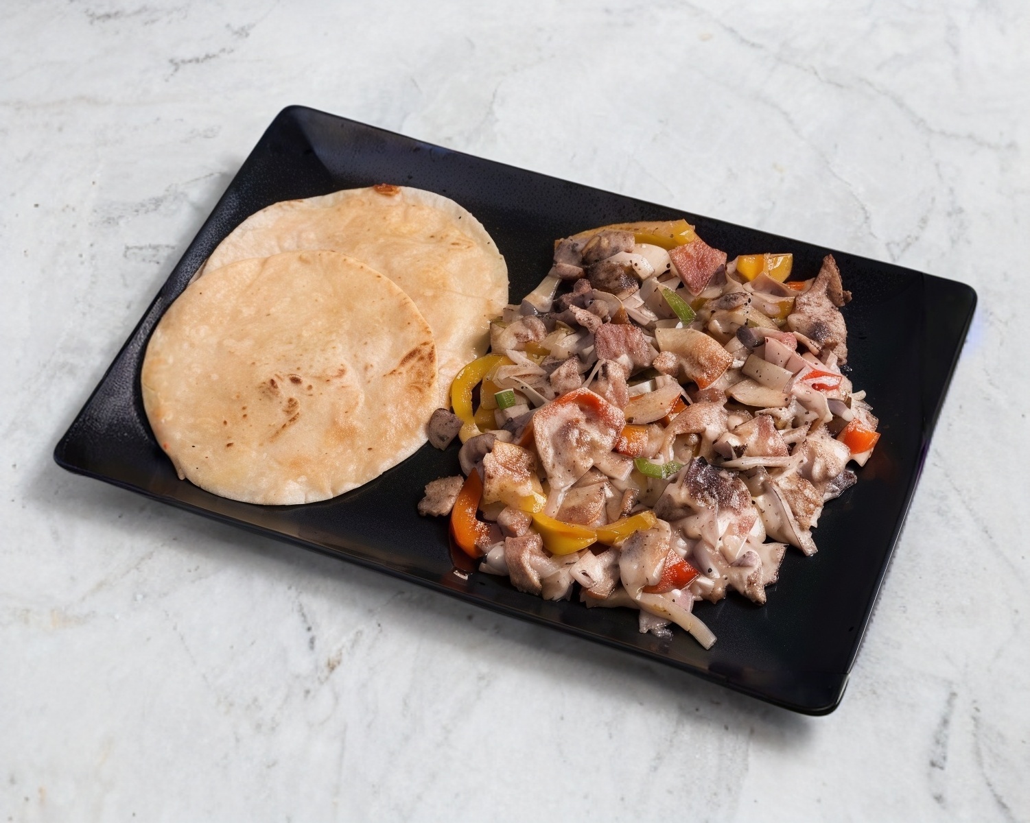 Arrachera, morrón, cebolla, tocino ,queso y tortillas