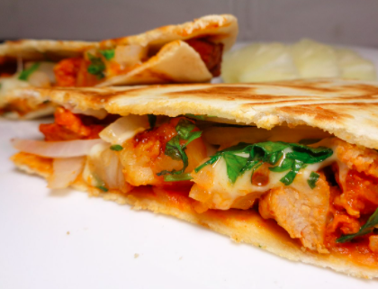 Pechuga de pollo gratinada en dos tortillas de harina