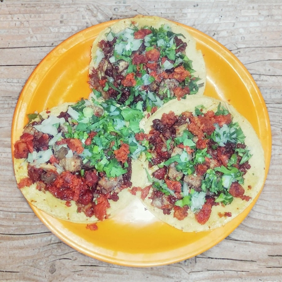 Suadero con longaniza, queso, cilantro y cebolla.