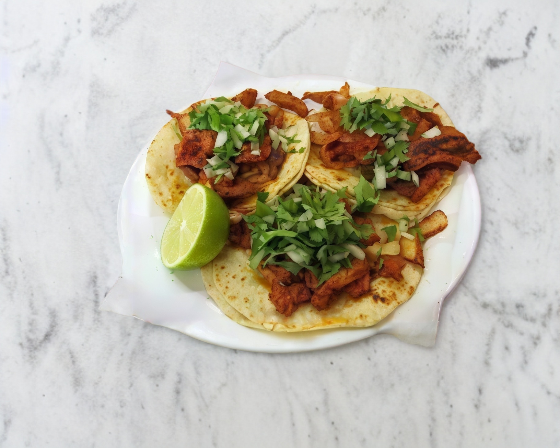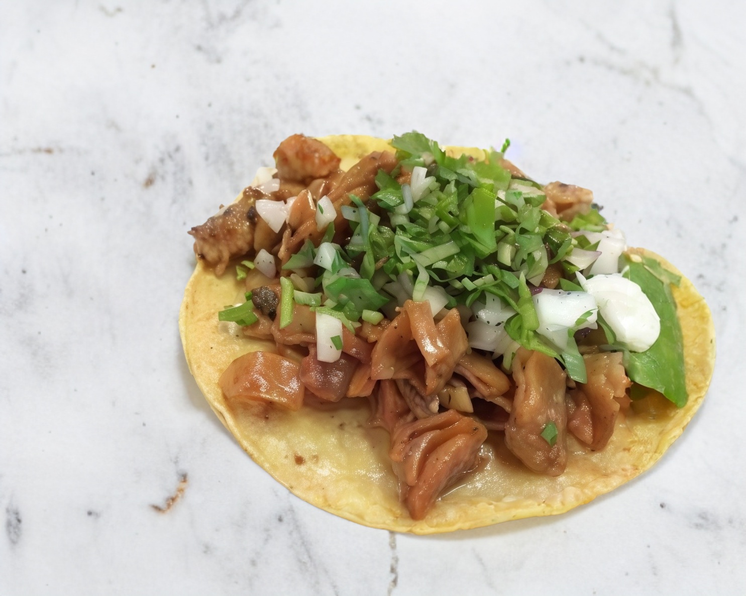 Pastor, piña, queso, cilantro y cebolla en tortilla de harina.