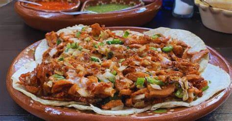 Arrachera, bistec, pollo, longaniza, nopales, cebollas y queso panela. Bañado en salsa de guajillo.
