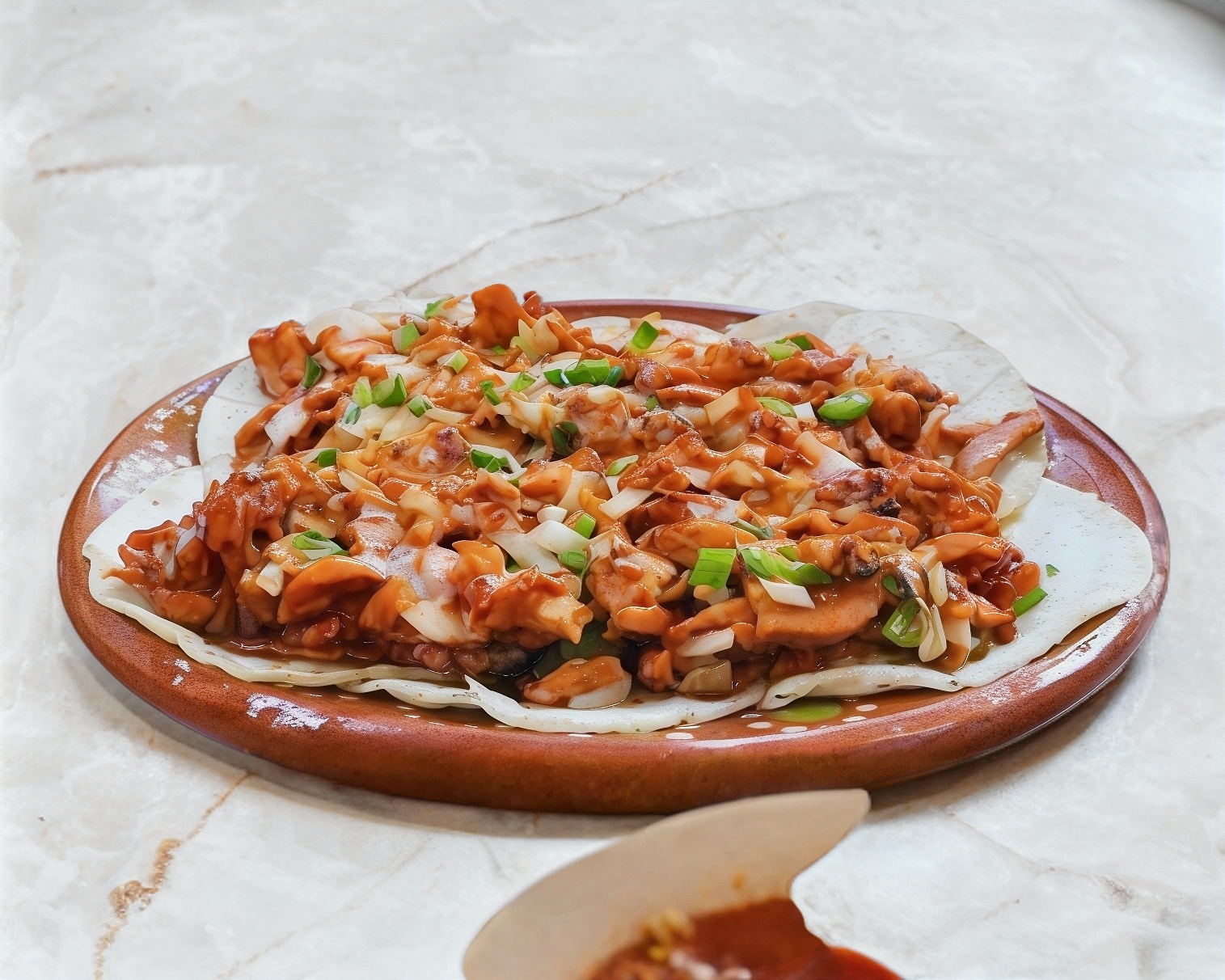 Pan arabe en forma de burrito gratinado con cebolla y cilantro