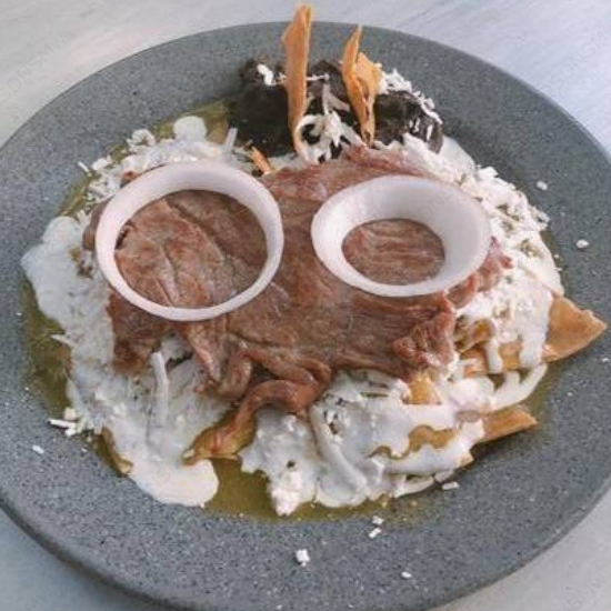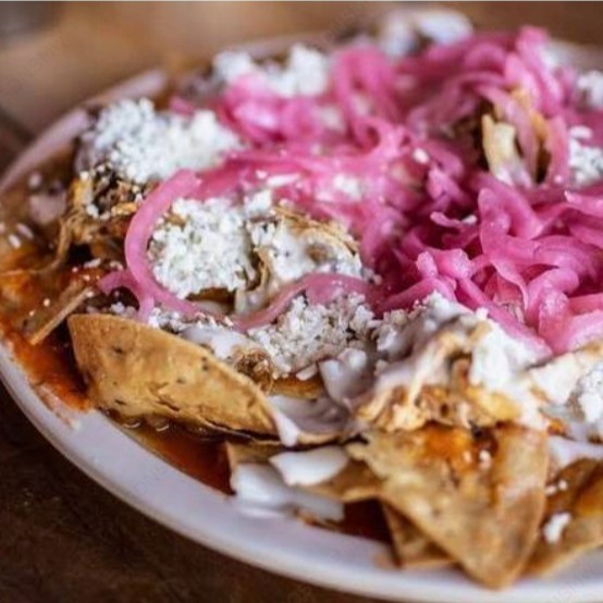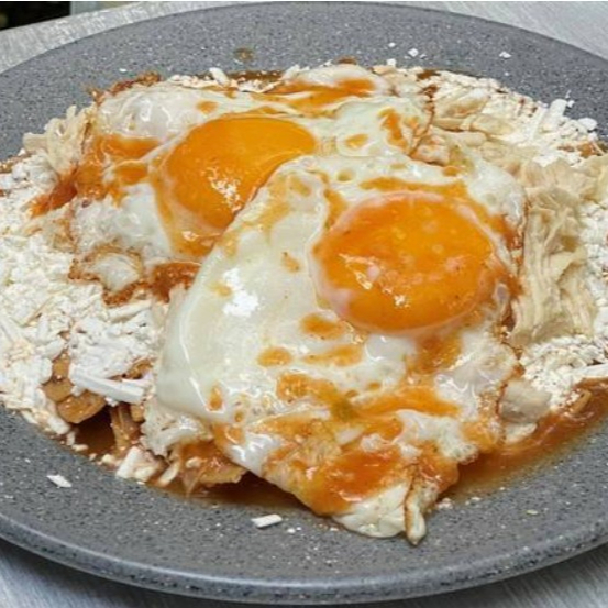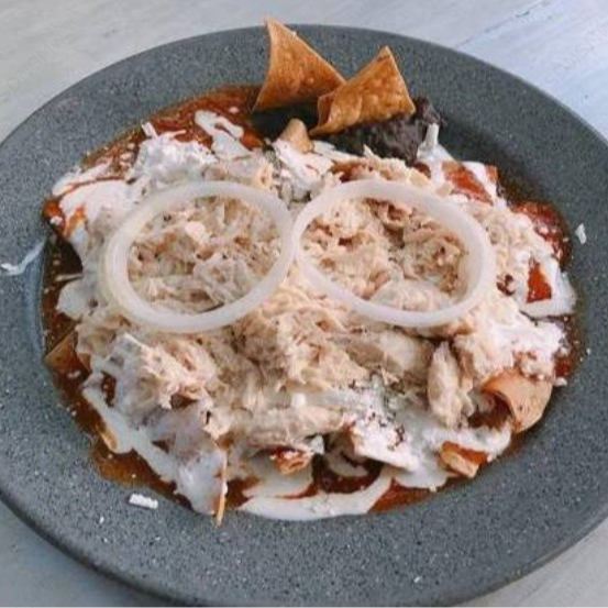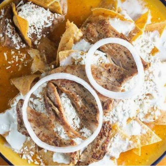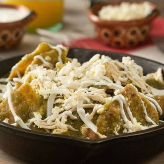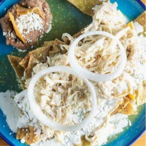 Deliciosos chilaquiles verdes con chilorio, crema, queso, cebolla y frijoles refritos.