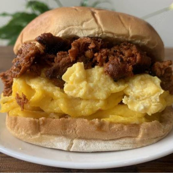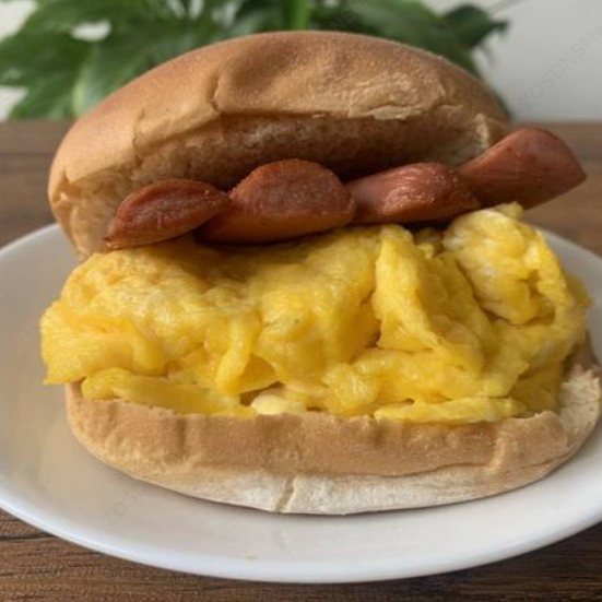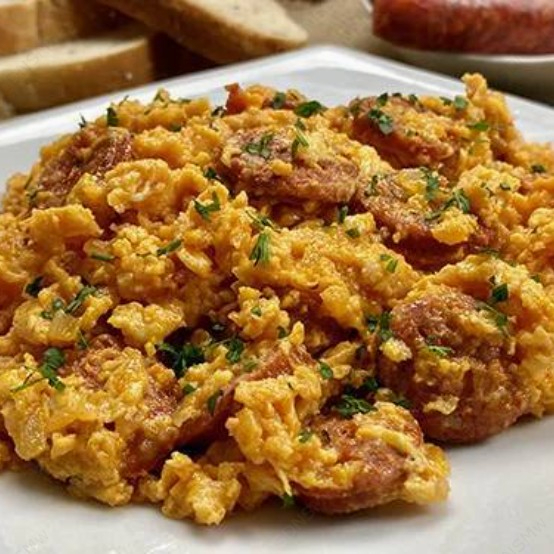 2 Huevos revueltos con chorizo y guarnición de frijoles refritos.