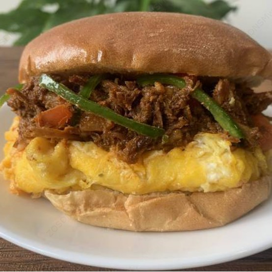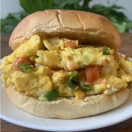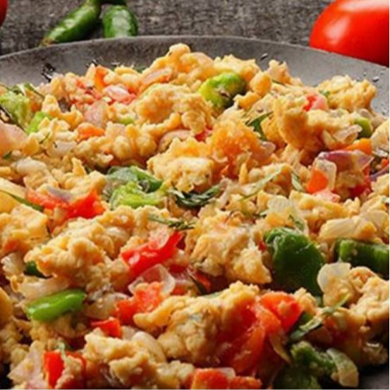 2 Huevos revueltos con jitomate, cebolla y chile, acompañados de frijoles refritos.