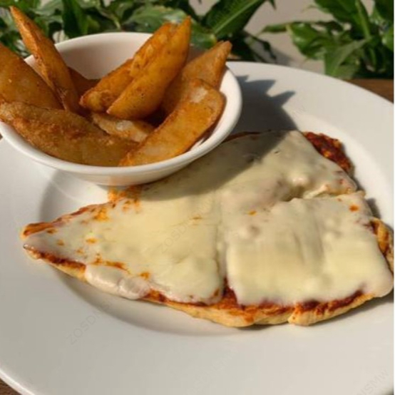 Pechuga a la plancha con una mezcla de pimientas rojas, queso gratinado con papas gajo.