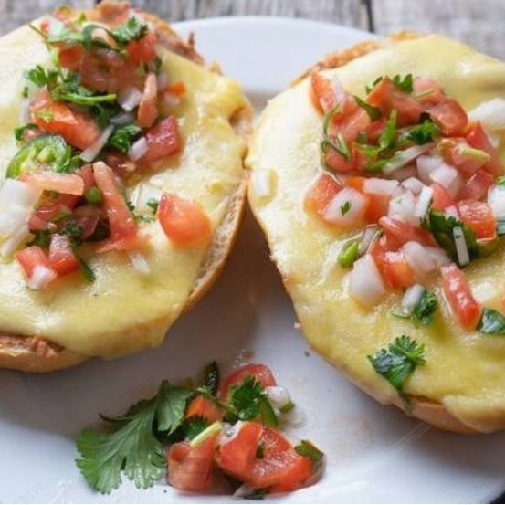 2 molletes con frijoles refritos y queso manchego doradito acompañados de pico de gallo.