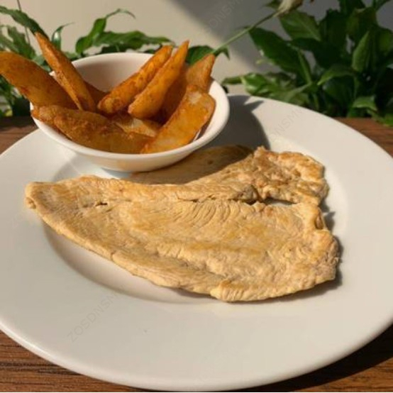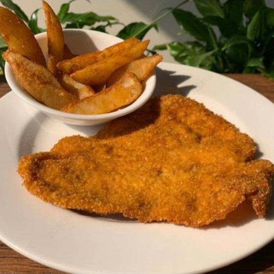 Pechuga empanizada con papas gajo más una Coca Cola.