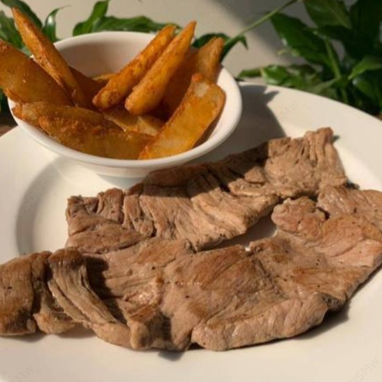 Arrachera a la plancha con papas gajo más una Coca Cola.