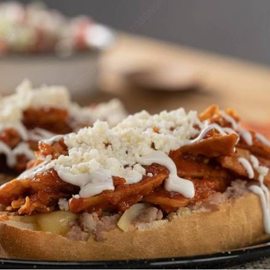 2 molletes con frijoles refritos, queso manchego y chilaquiles con crema, queso y cebolla.