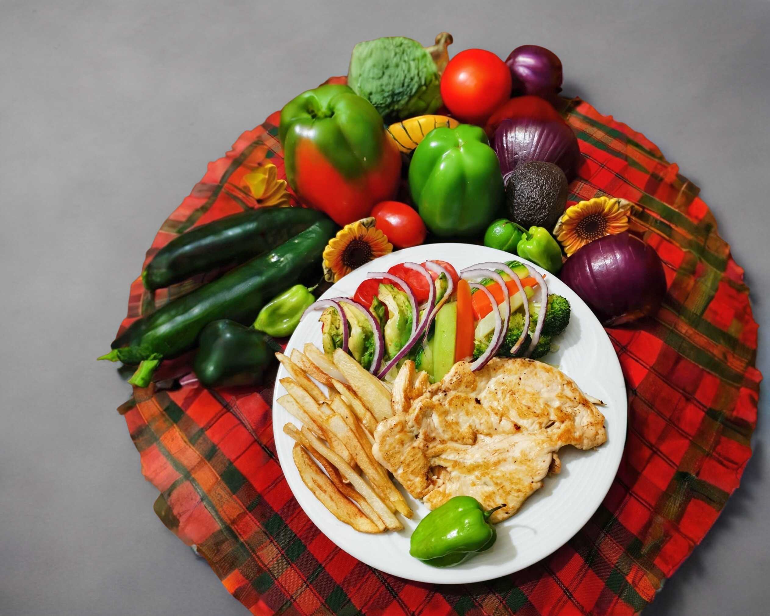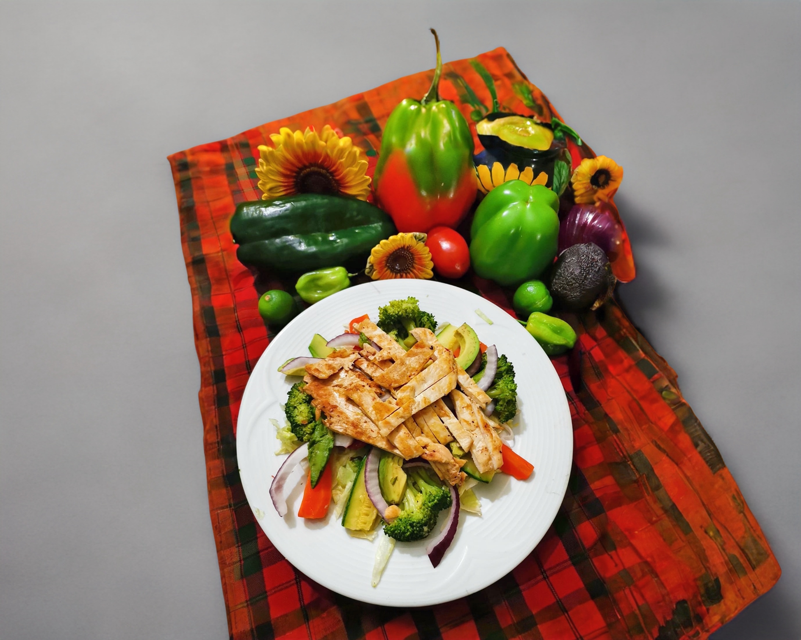 (Pechuga a la Plancha) Con verduras al vapor, lechuga, jitomate, cebolla, aguacate.