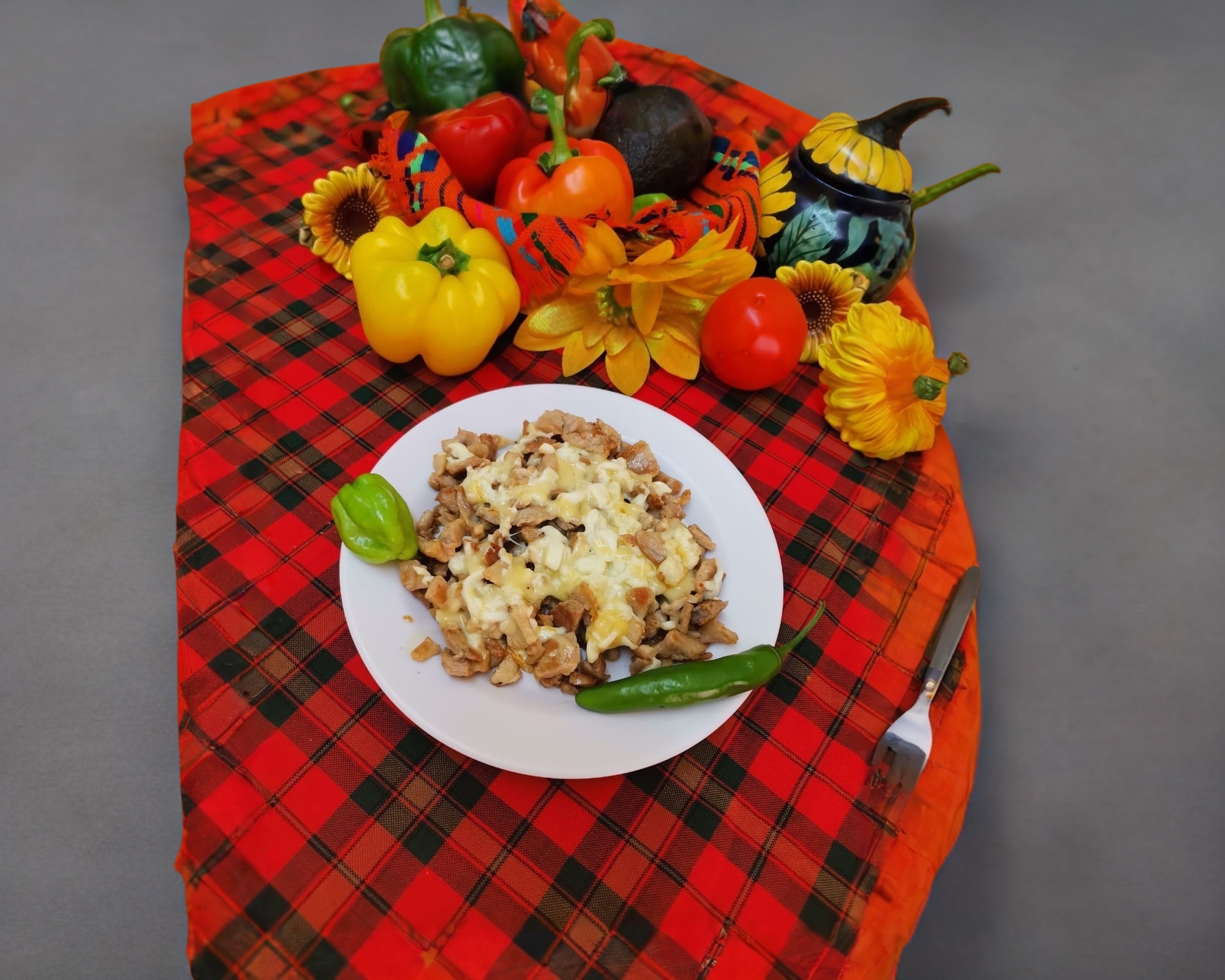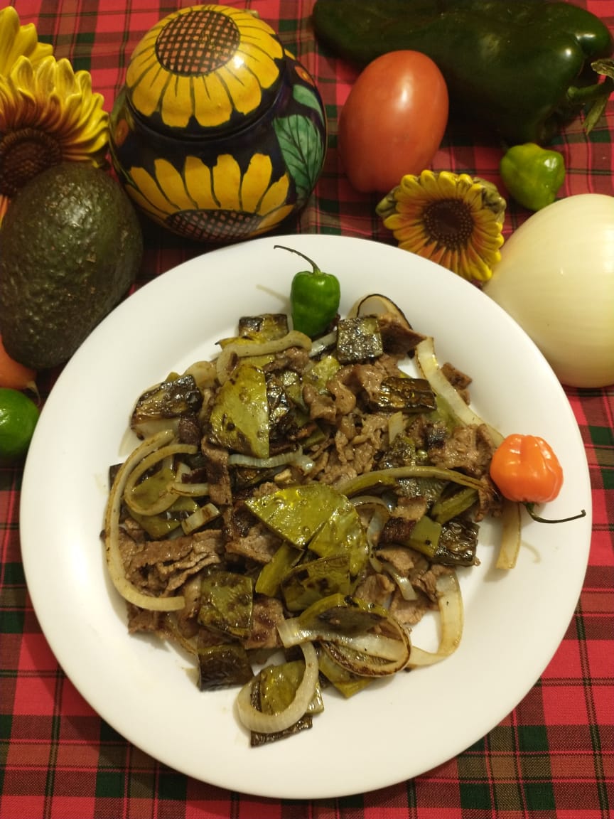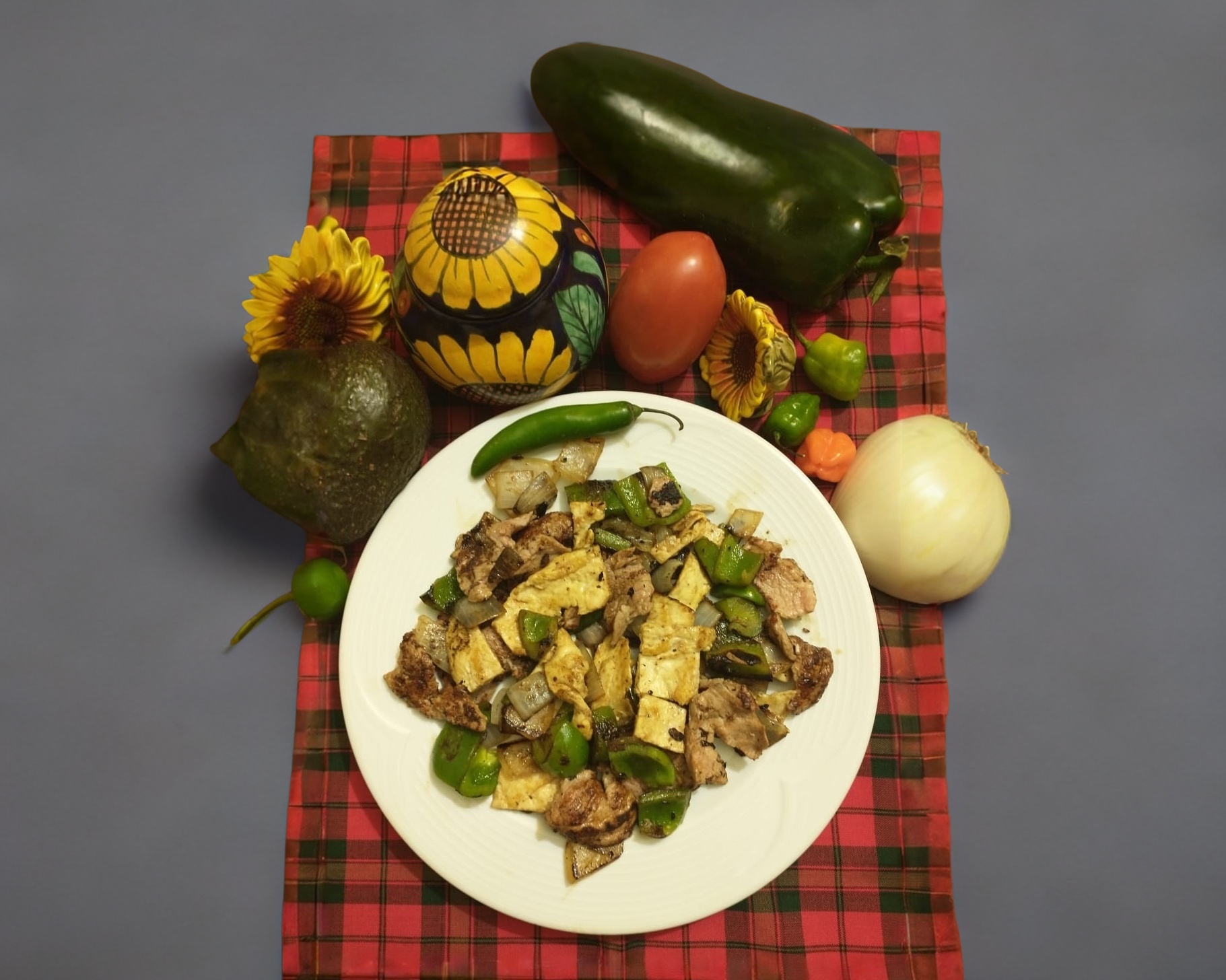 Arrachera, pechuga, morrón, cebolla, queso gratinado