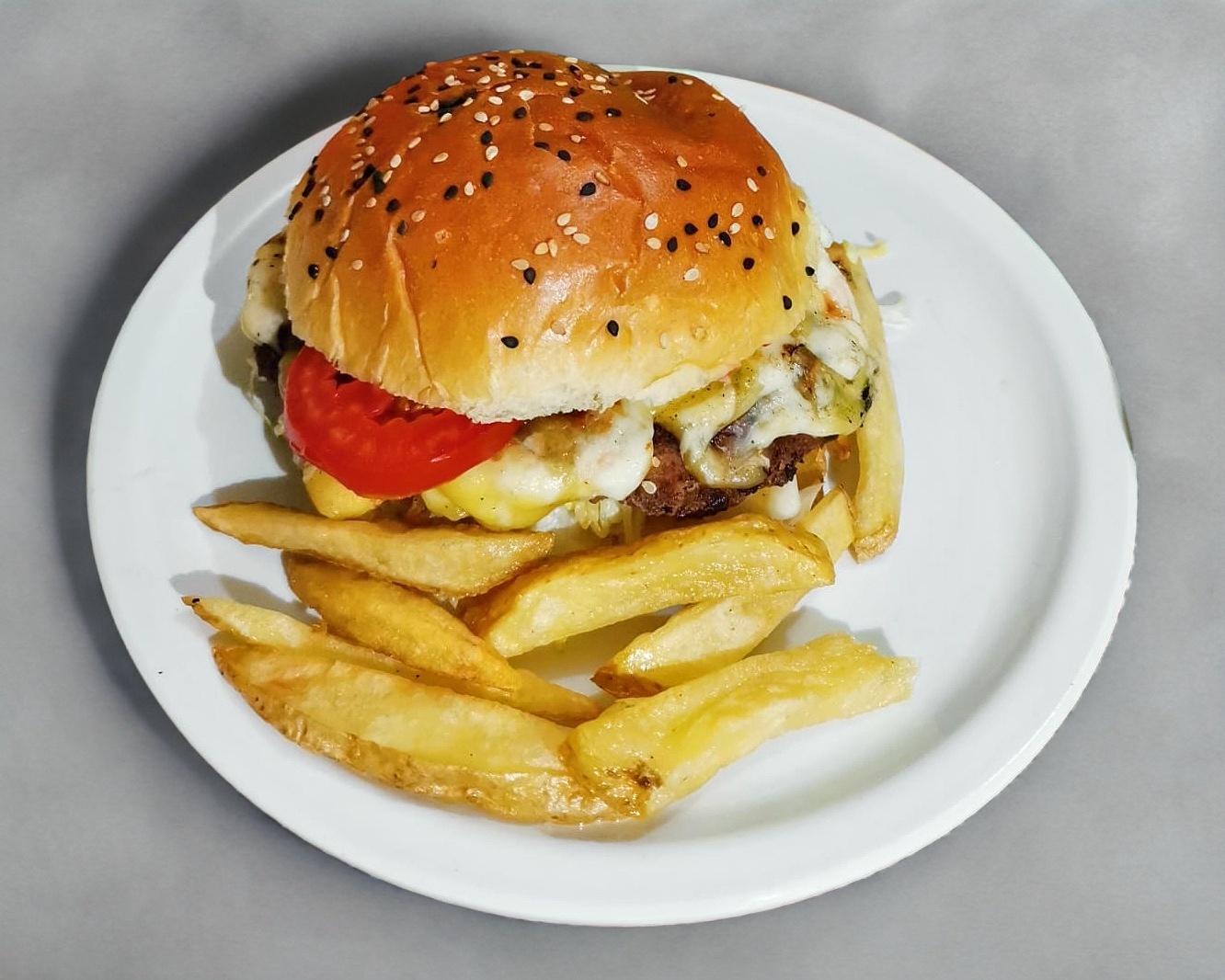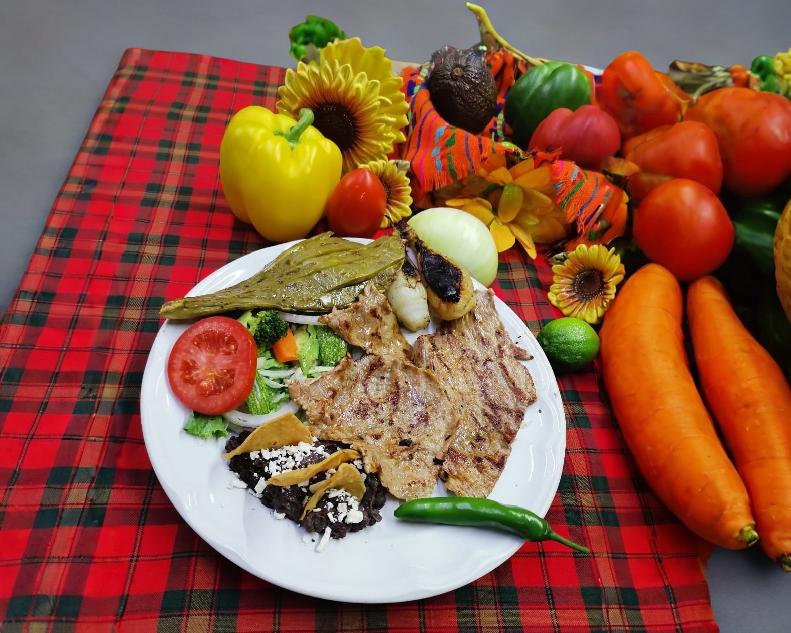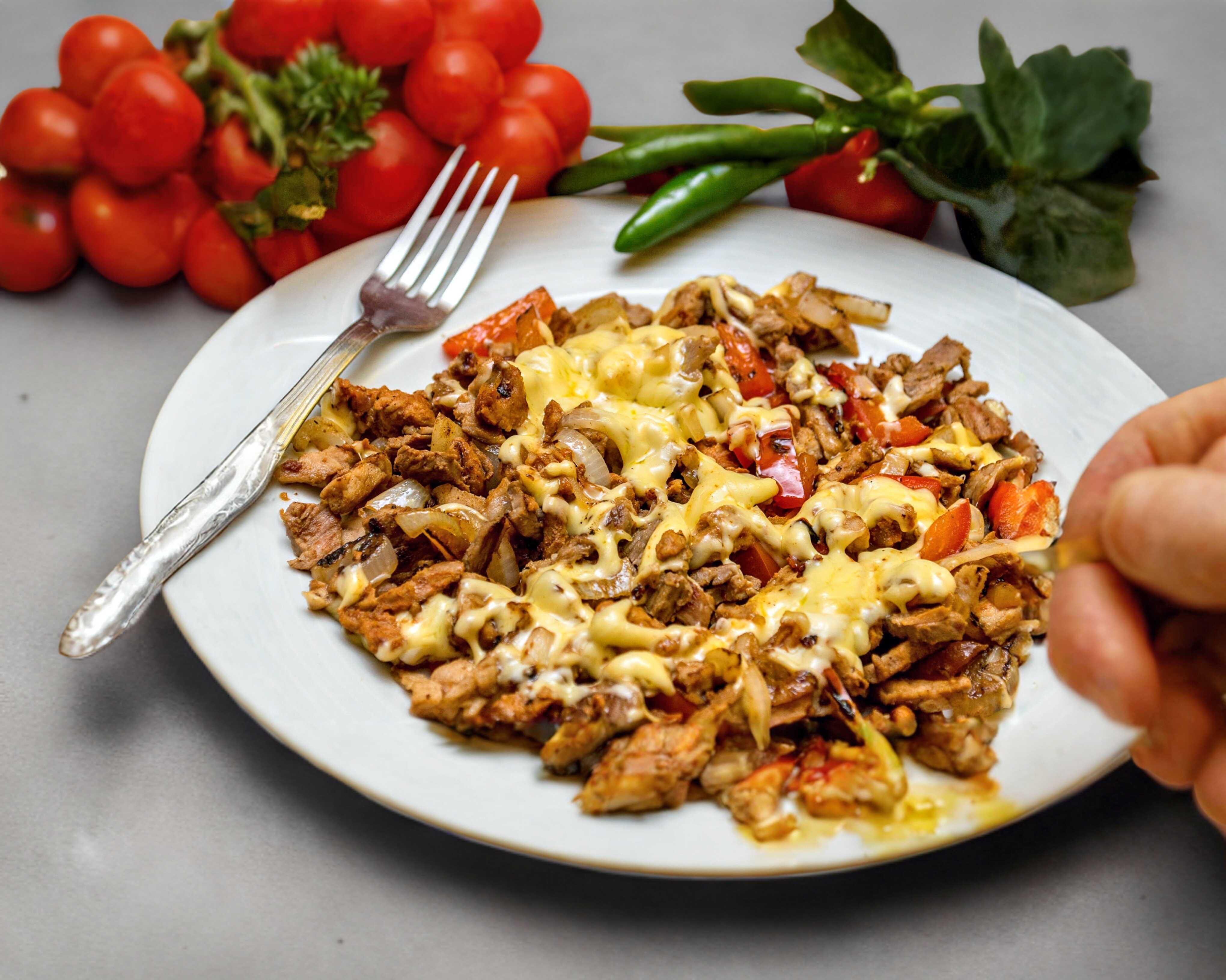 Arrachera, pechuga, morrón, cebolla, queso gratinado