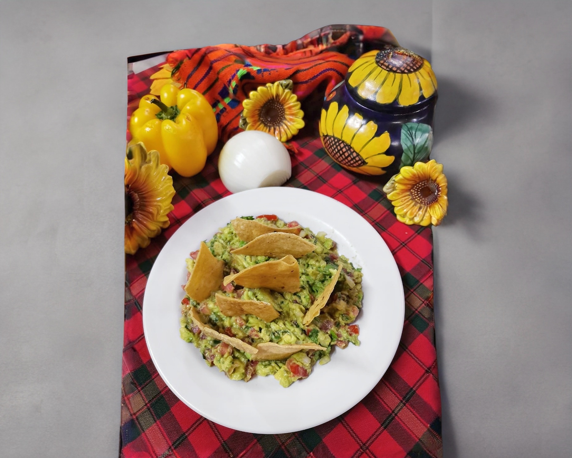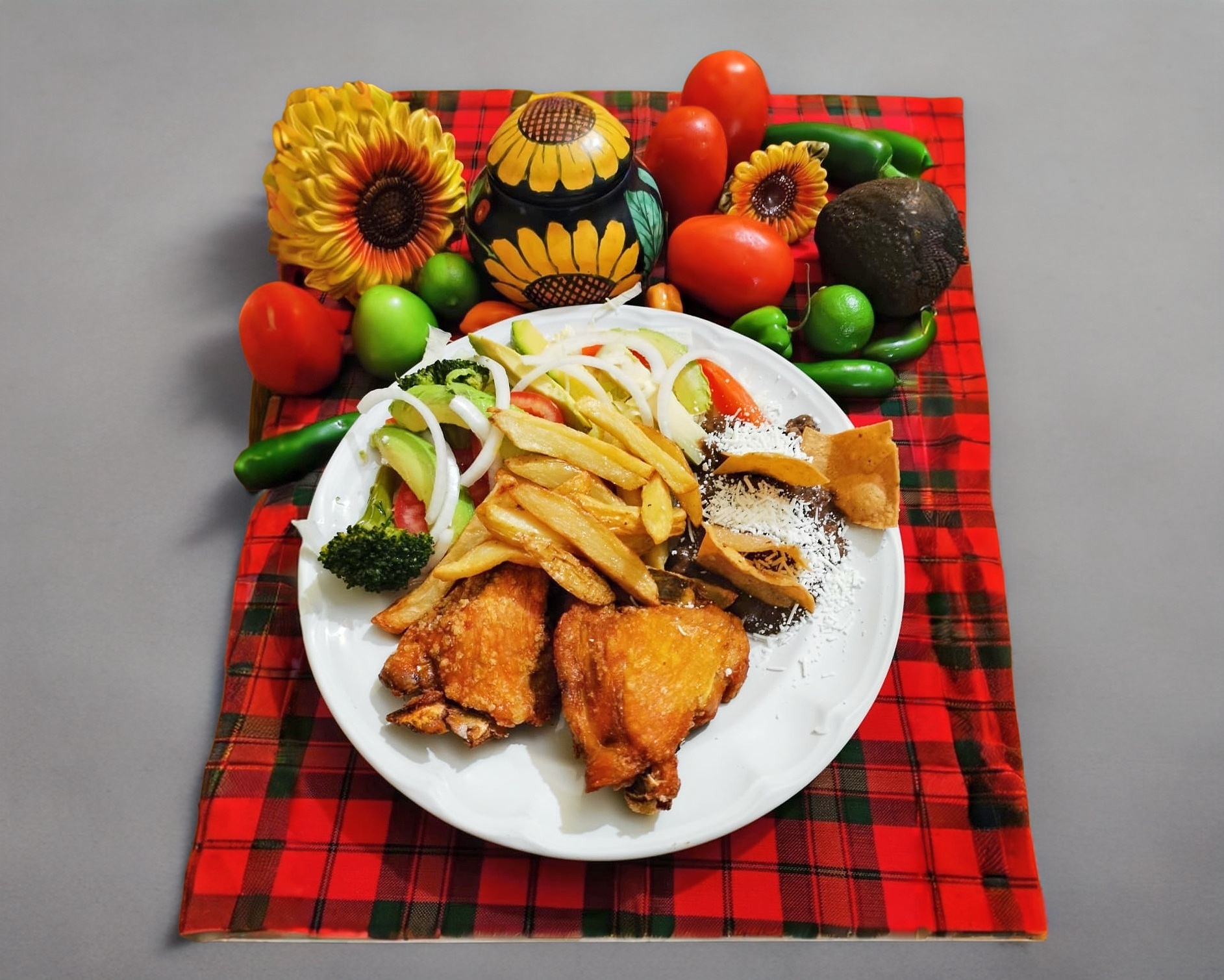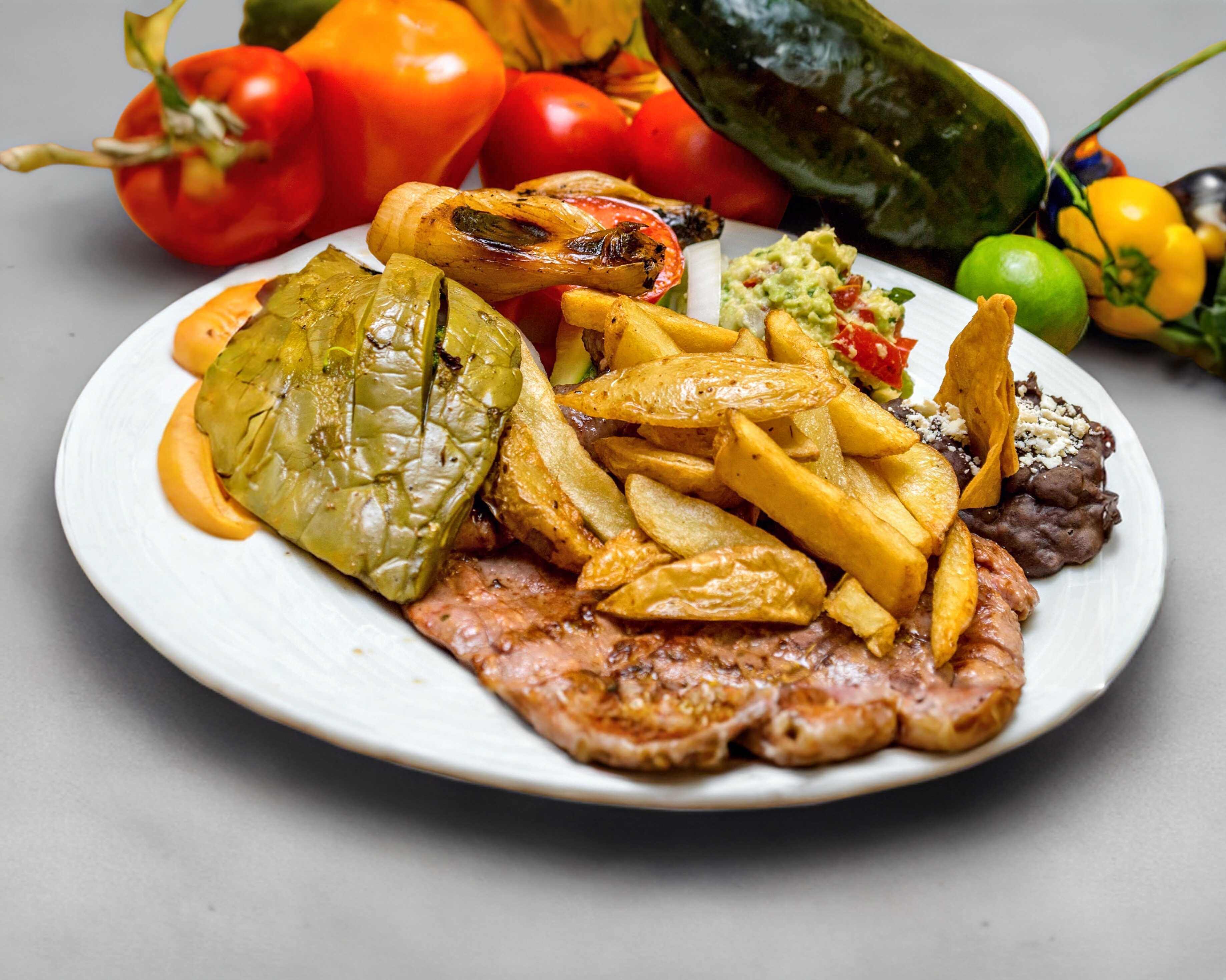 Papas a la francesa, guacamole, verduras, frijoles refritos, nopal y cebollitas.