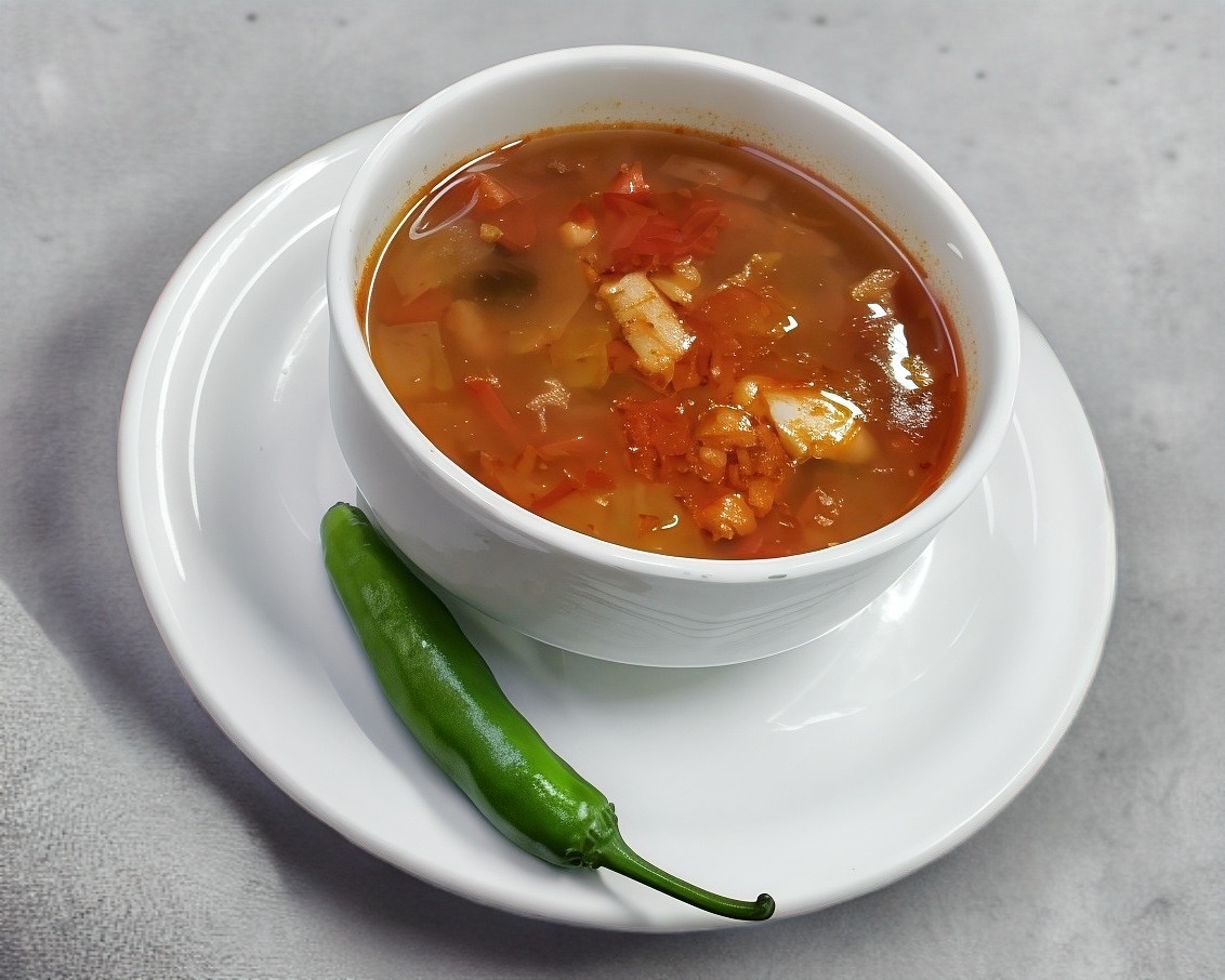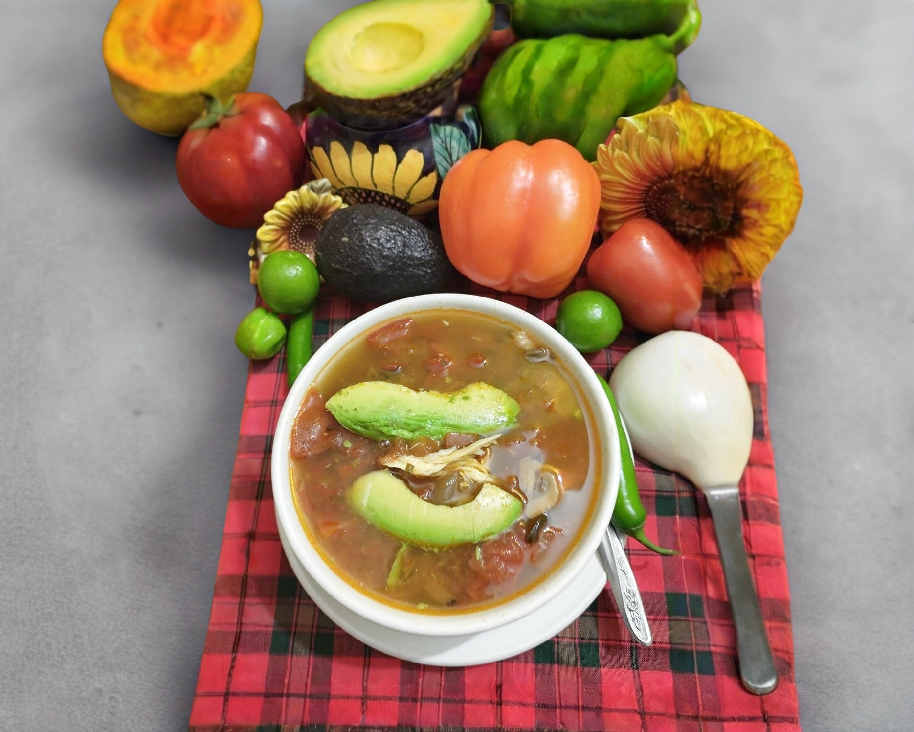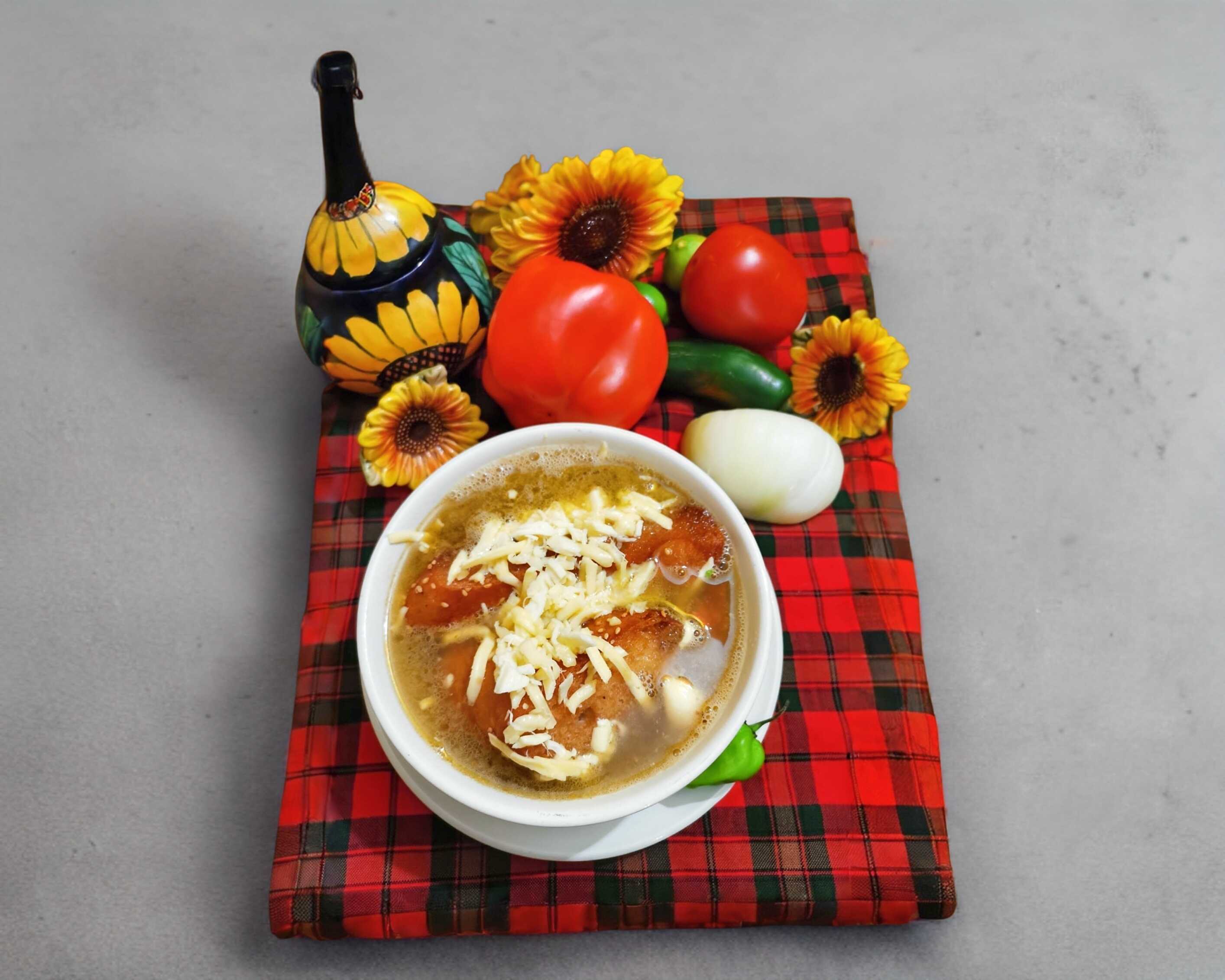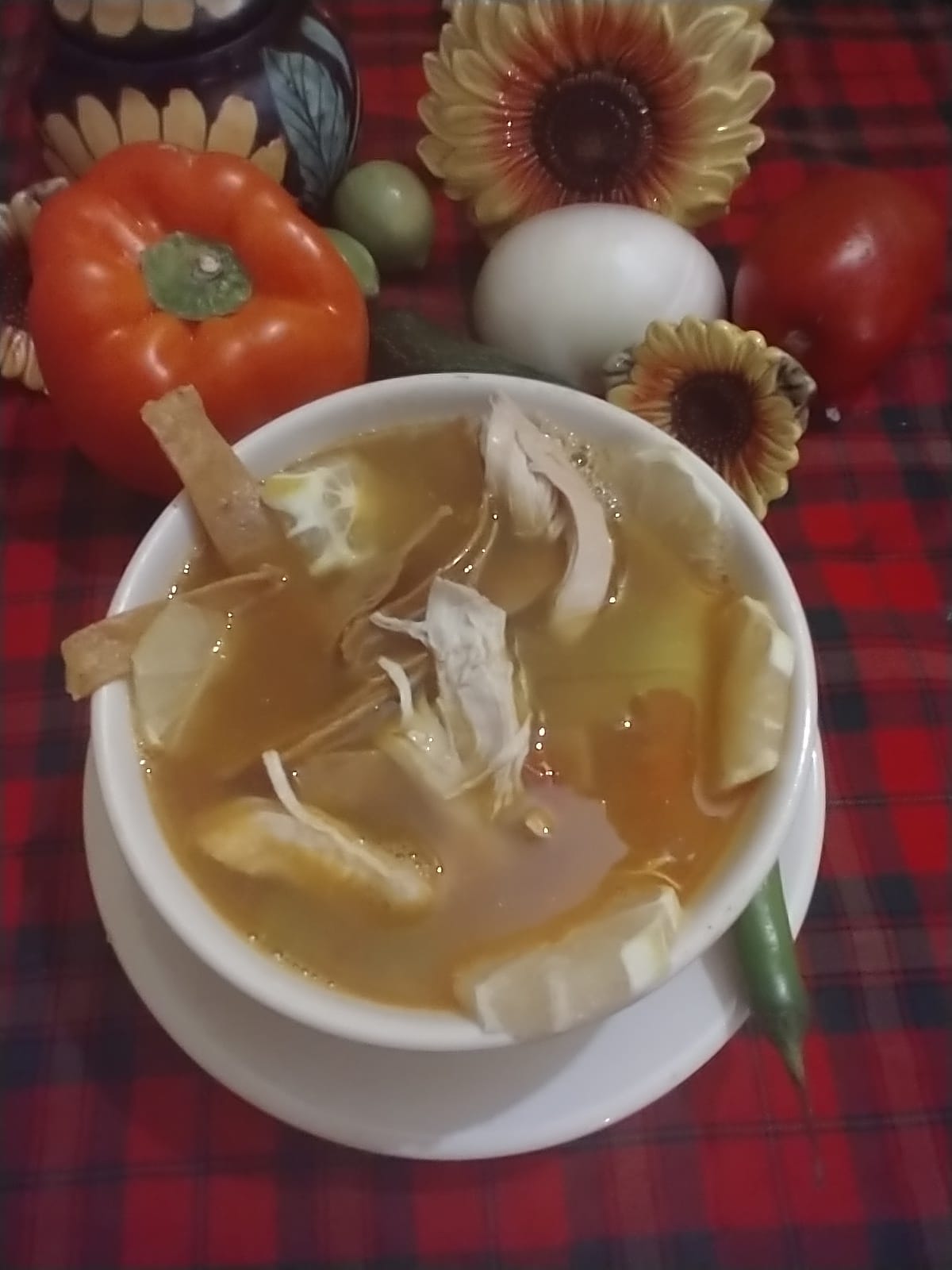 caldo rojo casero con el toque perfecto de especias, servido con tiritas de tortilla frita crujiente, queso fresco desmoronado, crema suave, aguacate cremoso y un toque de chile pasilla dorado que realza su aroma y sabor.