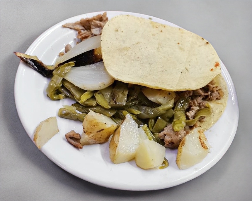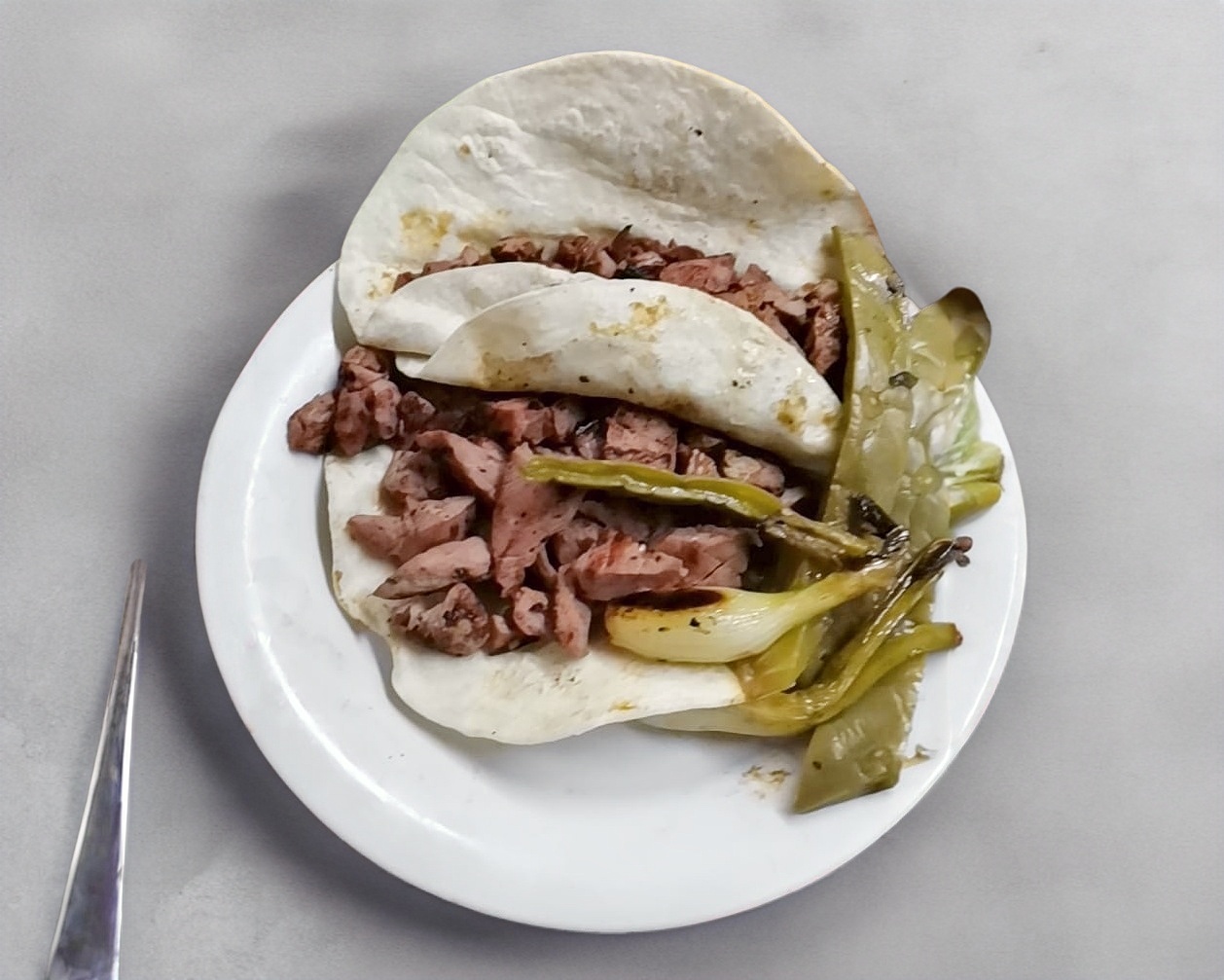 3 tortillas de harina, arrachera, nopales y cebollitas. (Porción personal)