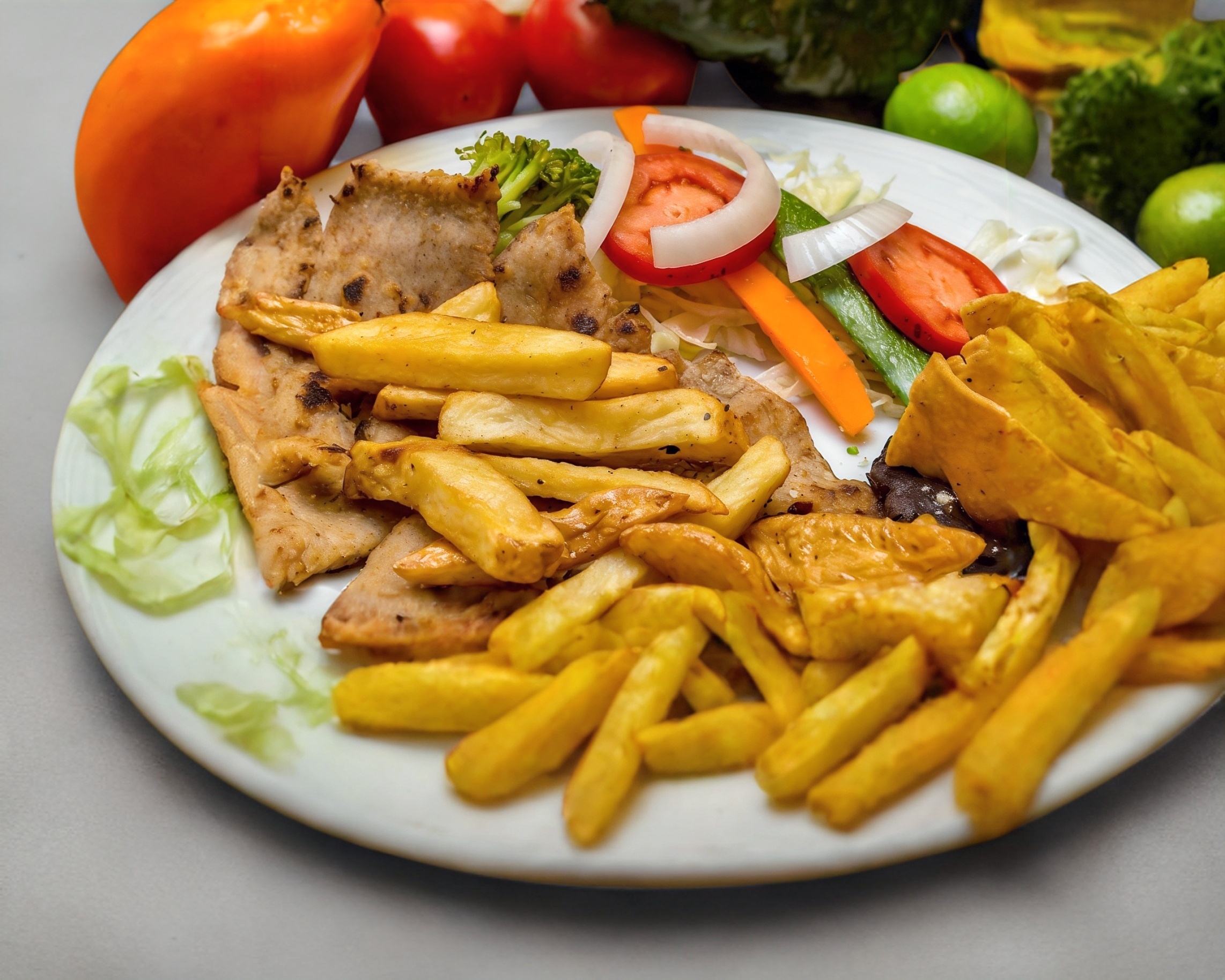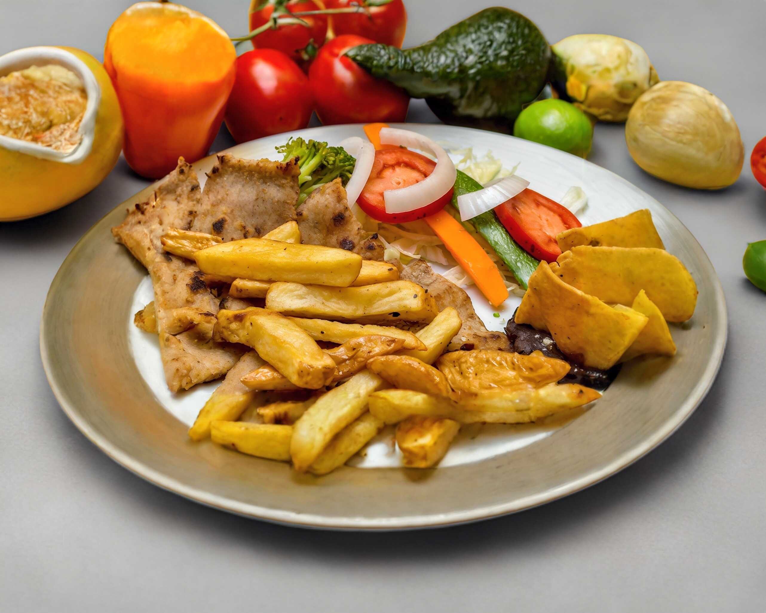 Papas a la francesa, verduras, frijoles refritos, totopos.