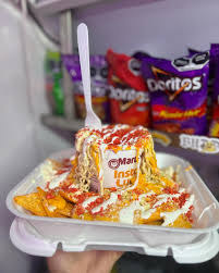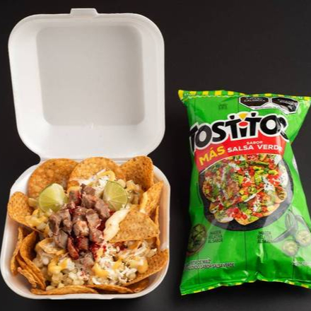 Con suadero y esquites, incluye mayonesa, queso, limón, sal y picante, Doritos nacho, Fleming hot, Diablo, Tostito verde, Rules, Chetos Fleming hot y Sabritas crujiente.