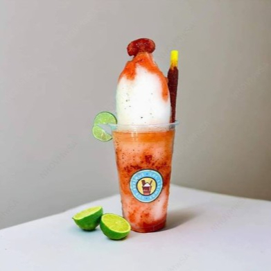 Chamoyada sabor a limón con chamoy y Tajín, unas banderillas y una gomita de mango enchilado.