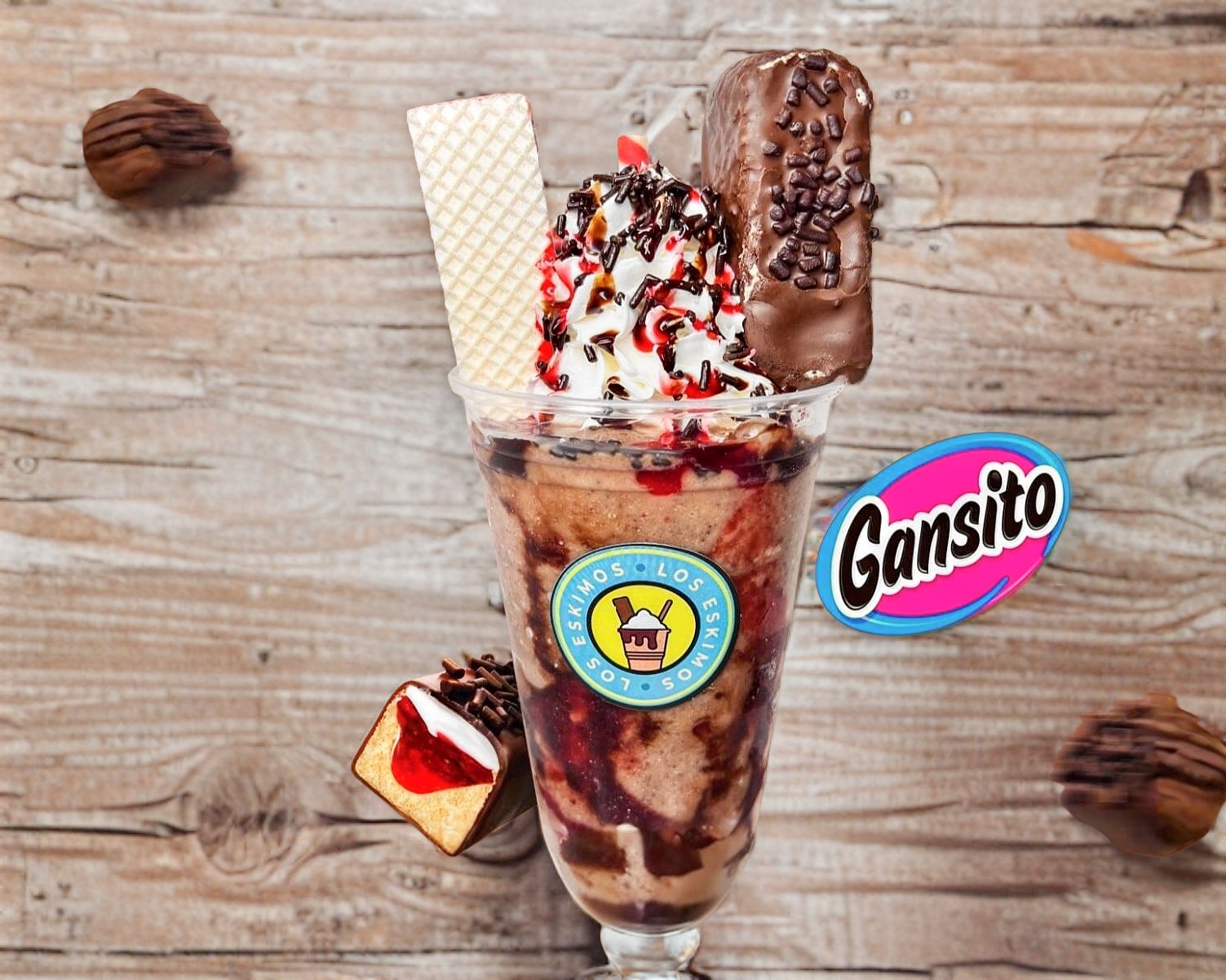Frappé de chocolate con fresa y gansito molido mas un gansito de tooping y galletas. 16 onzas.