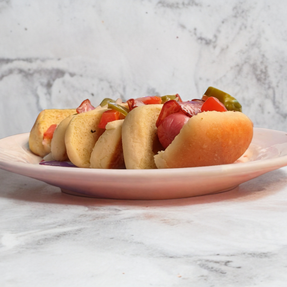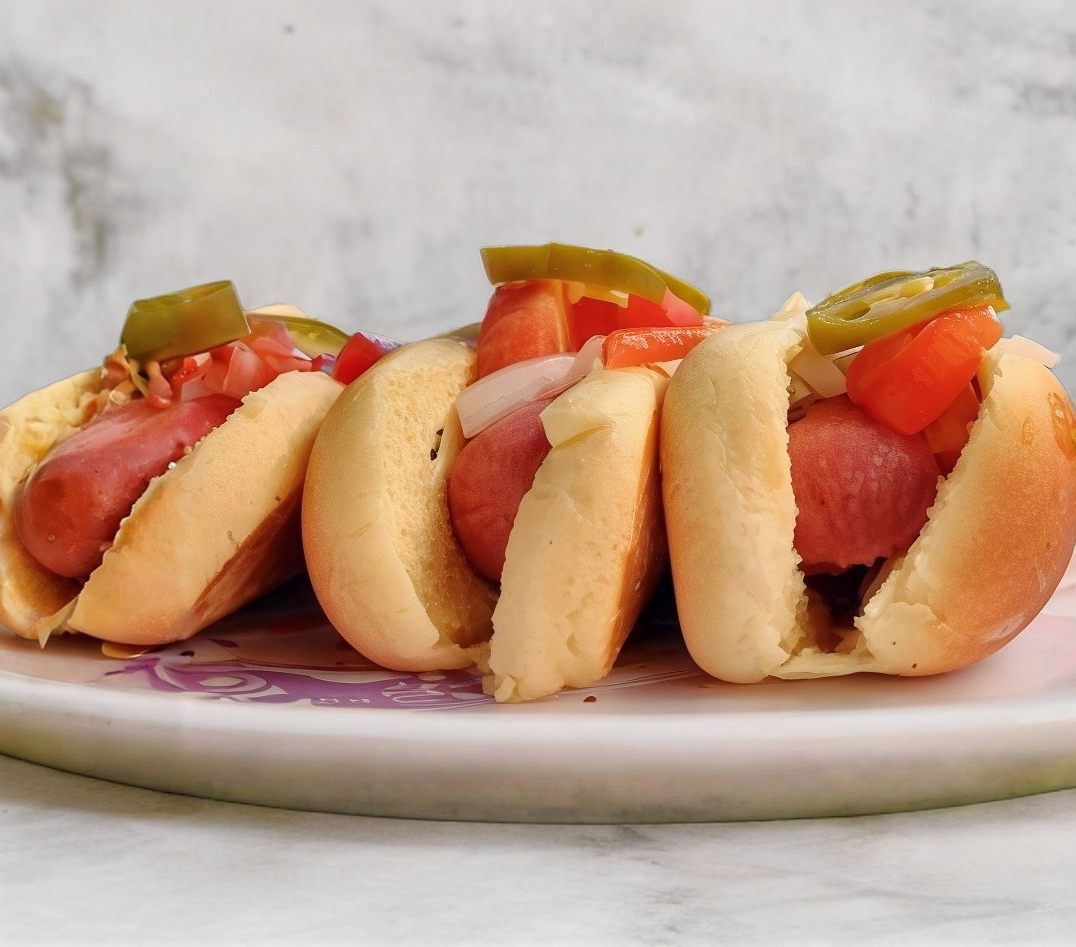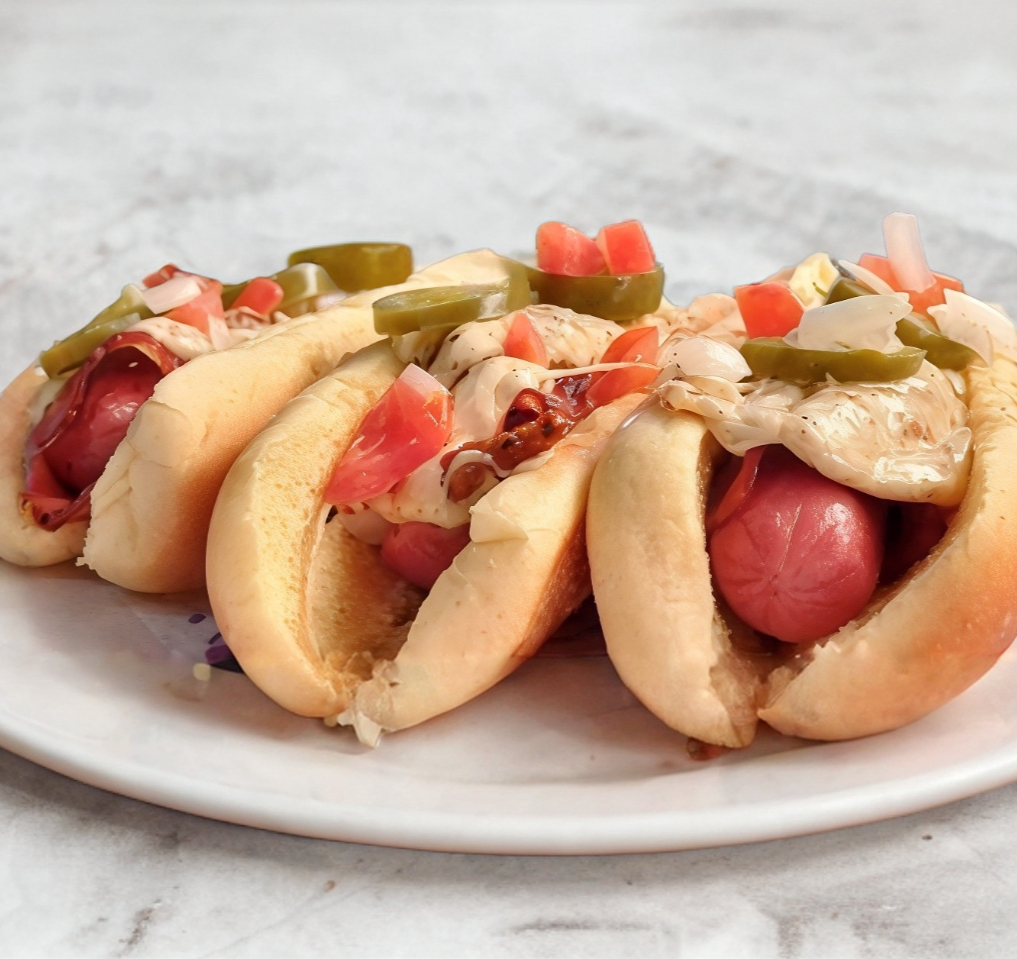 Salchicha viena con mayonesa, frijoles, jitomate, cebolla, aguacate y picante.