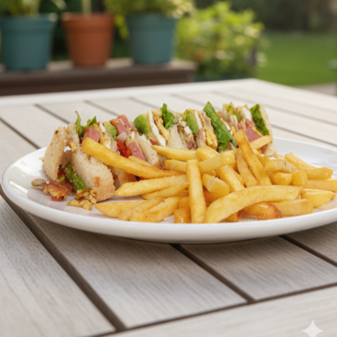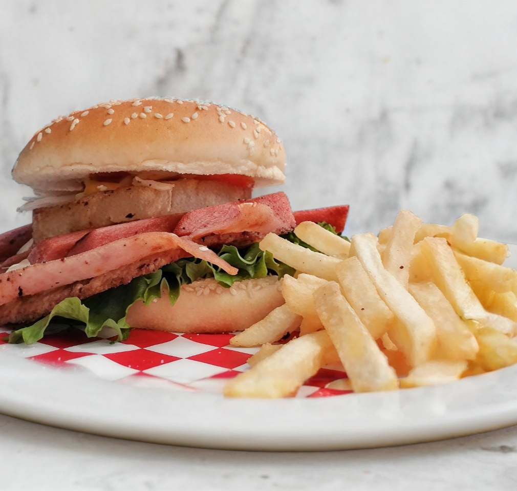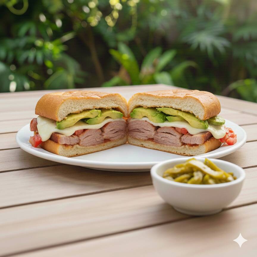 Acampañado con porción de papas a la francesa (100 gr), jamón de pavo, tocino, queso manchego con 3 panes, lechuga, jitomate, cebolla, aguacate y picante a elegir entre rajas o chipotle.