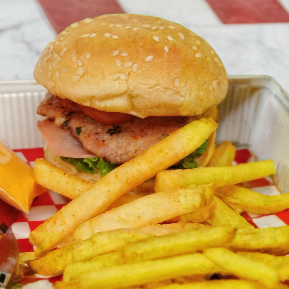 Acampañado con porción de papas a la francesa (100 gr.), pollo asado, tocino, queso manchego con 3 panes, lechuga, jitomate, cebolla, aguacate y picante a elegir entre rajas o chipotle.
