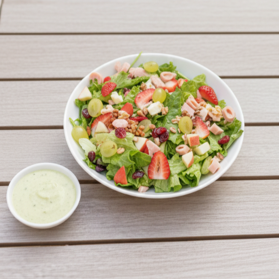 Lechuga, uva, manzana, fresa, jamón de pavo, nuez, arándanos, complemento y aderezo a elegir. 350 gr aprox