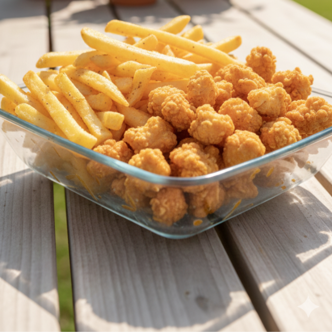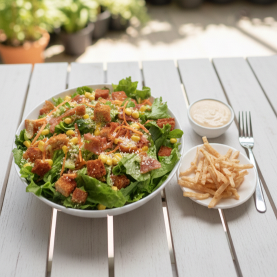 Lechuga, grano de elote, zanahoria rallada, pepino, nuggets, tocino, ajonjolí natural, complemento y aderezo a elegir. (350 gr aprox)