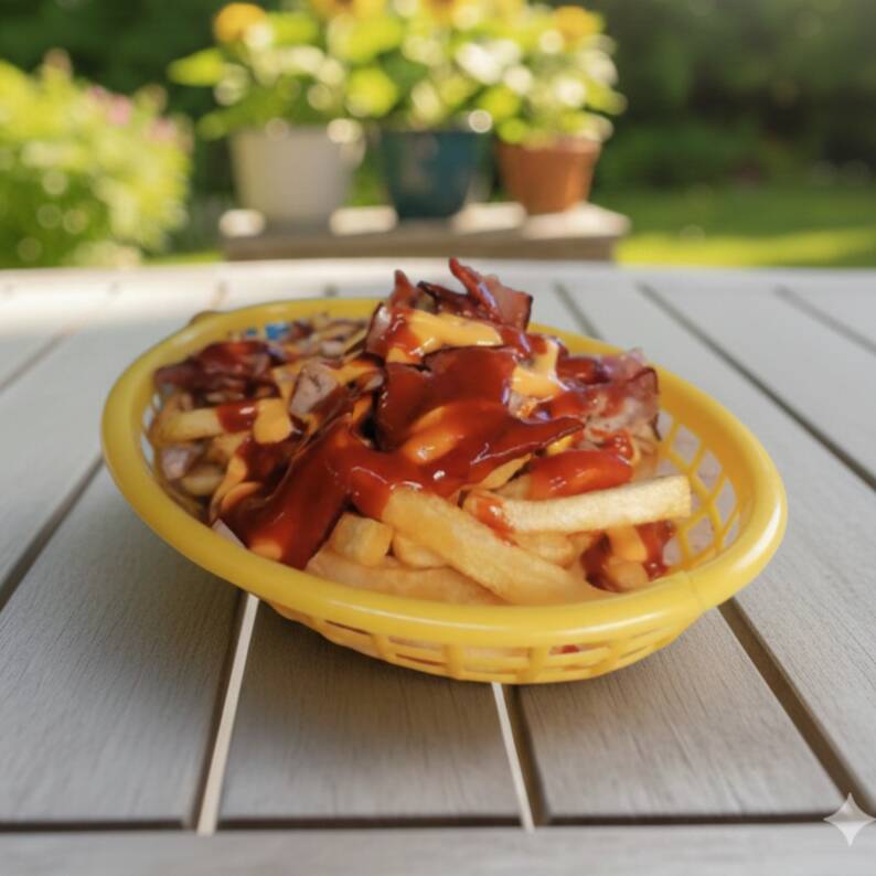 Carne asada, tocino, 250 gr. papas a la frnacesa con catsup, queso amarillo y salsa.