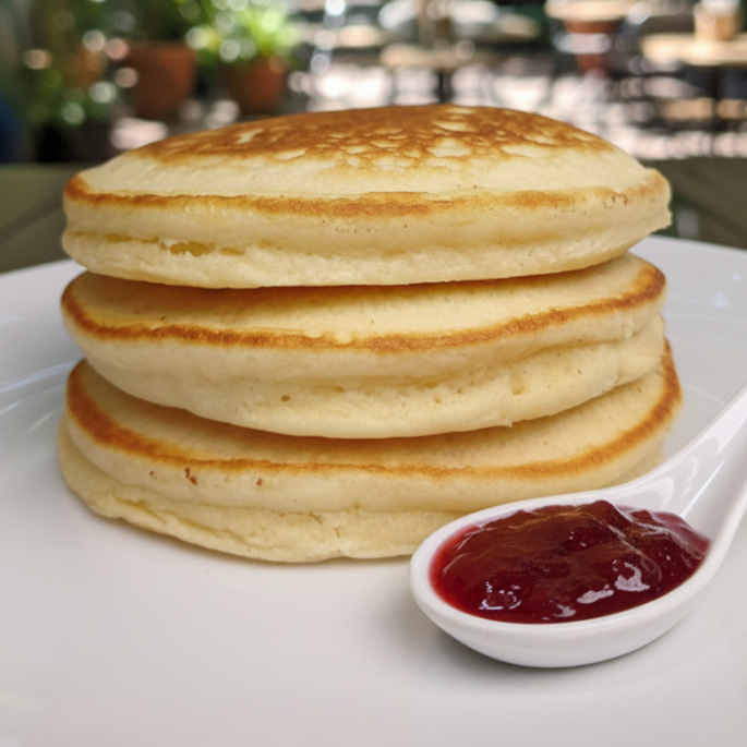 3 piezas de hot cakes con mantequilla y jarabe a elegir