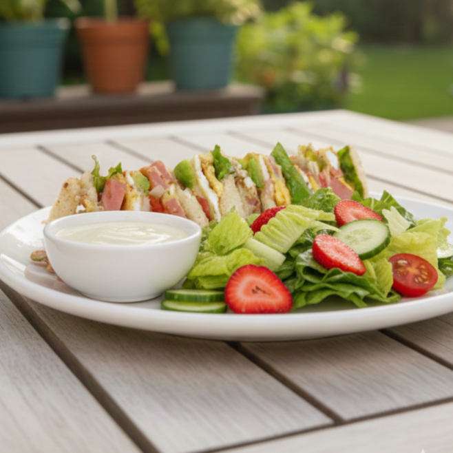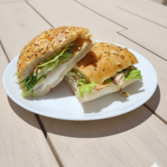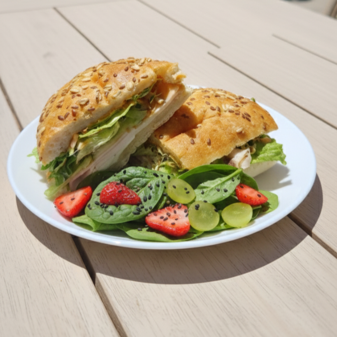 (platillo personal) acompañado con porción de ensalada (lechuga, espinaca, germen de alfalfa, pepino, zanahoria, semilla de girasol, almendra fileteada, fruta) y aderezo. A escoger el sandwich entre pollo asado, jamón de pavo, salchicha viena o huevo con 3 panes, lechuga, jitomate, cebolla, aguacate y picante. Contenedor de (7x7 pulgadas)