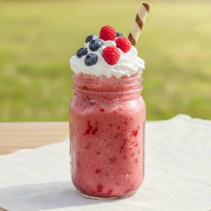 Nuestro frappé (16oz) hecho con frutos rojos de verdad. Una bebida cremosa y refrescante decorada con crema batida, jarabe de chocolate y granillo de colores. Acompañado de frutos rojos naturales y una galleta waffer por separado. ¡Un festín de sabor frutal que te va a encantar!