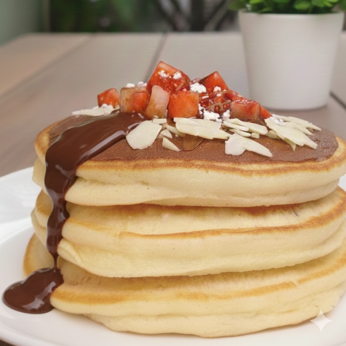 3 piezas de hot cakes con chispas de chocolate, nutella untada entre cada pieza, decorada con chocolate hershey's, almendra fileteada, fresa y azucar glass.
