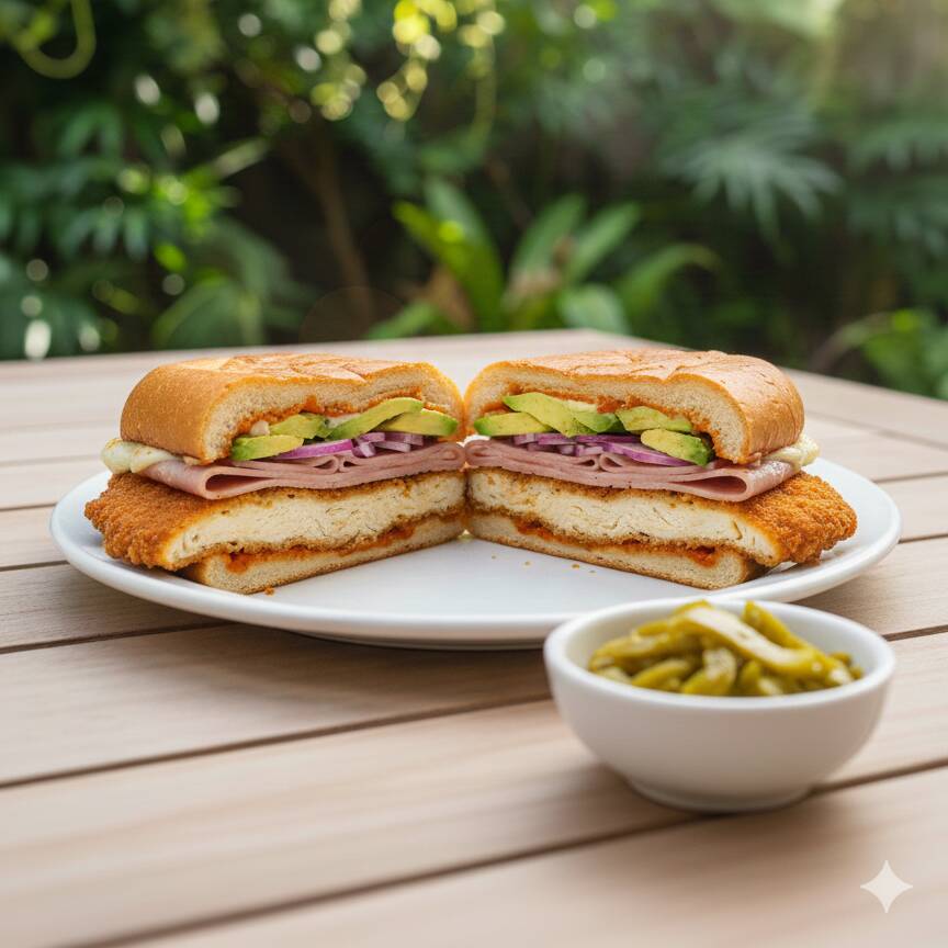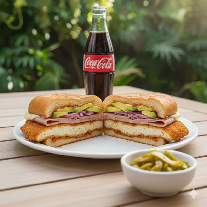 Milanesa de puerco, piña, tocino, jamón, queso amarillo, mayonesa, frijoles, jitomate, cebolla, aguacate y picante a elegir entre rajas o chipotle.
