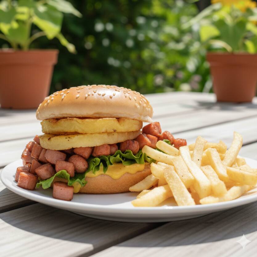 Carne, tocino, jamón, quesillo, piña, mayonesa, catsup, mostaza, jitomate, cebolla, rajas y lechuga, acompañada de 100 gr. de papas.