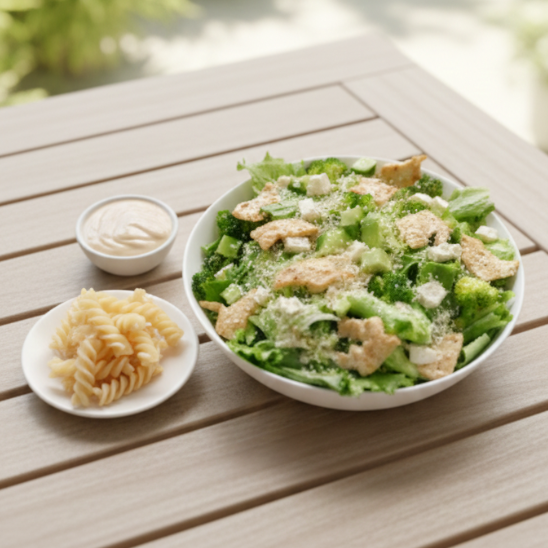 Untada con aderezo de la casa, otro aderezo a elegir, dos proteínas a elegir y tres verduras a escoger.
