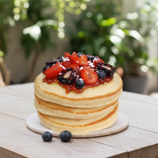 3 piezas de hot cakes con queso crema untada entre cada pieza y mermelada de fresa, decorada con frutos rojos y azucar glass.