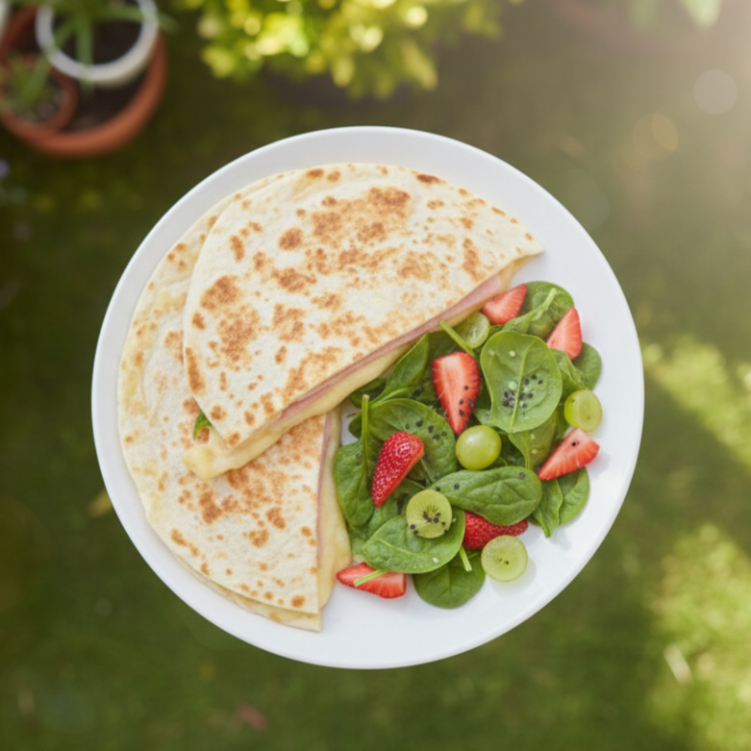 2 mitades de tortilla de harina con jamón, quesillo, queso amarillo, jitomate, cebolla, aguacate y picante. Con porción de papas (100 gr) o ensalada (lechuga, espinaca baby, ajonjolí negro, fresa, uva y aderezo a elegir).