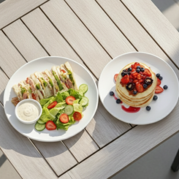 Desayuno completo y delicioso: nuestro clásico Club Sándwich acompañado de esponjosos hot cakes del bosque. Ideal para empezar el día con energía y sabor. 🍓 ¡Una combinación dulce y salada que te va a encantar!