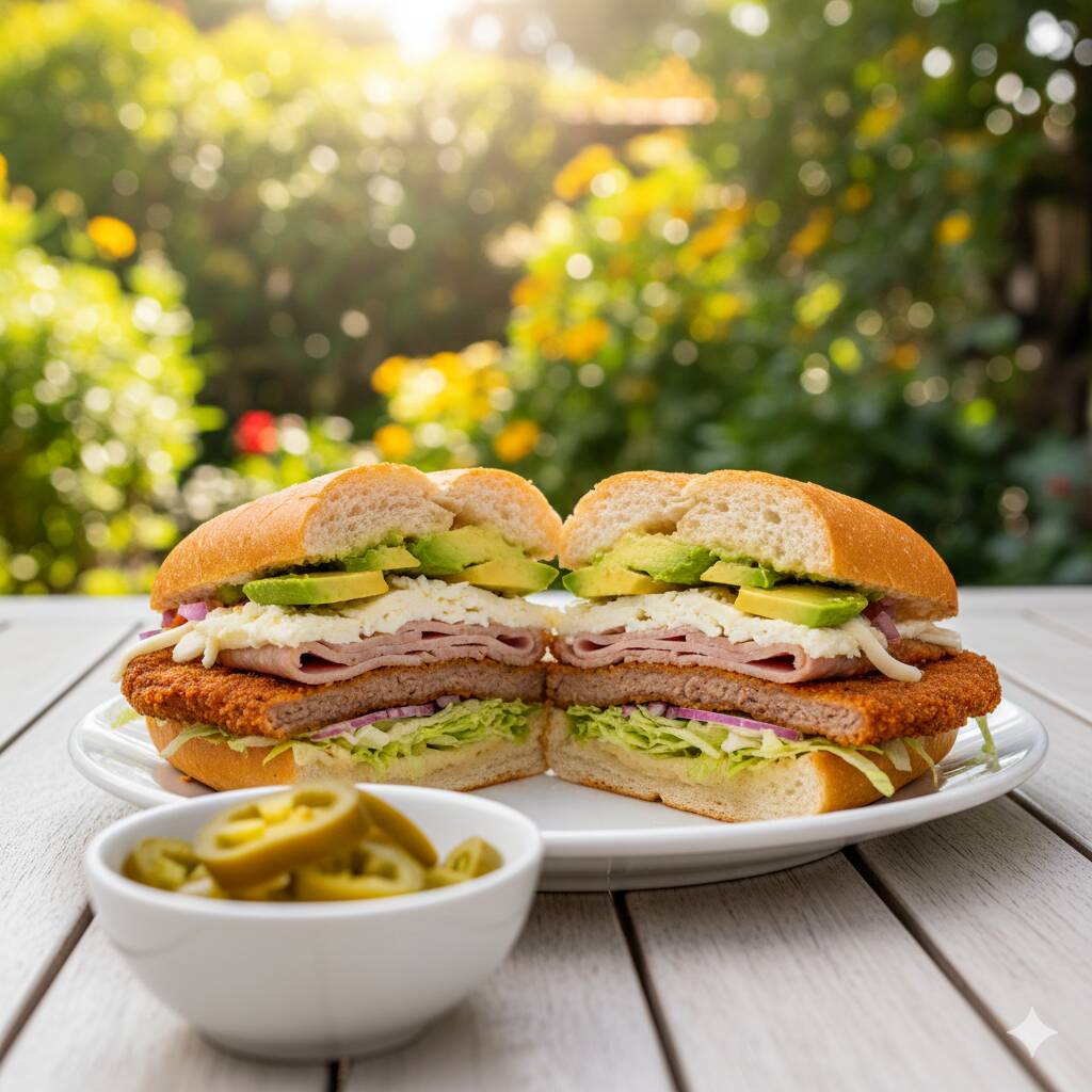Milanesa de puerco con quesillo y pierna española, mayonesa, frijoles, jitomate, cebolla, aguacate y picante.
