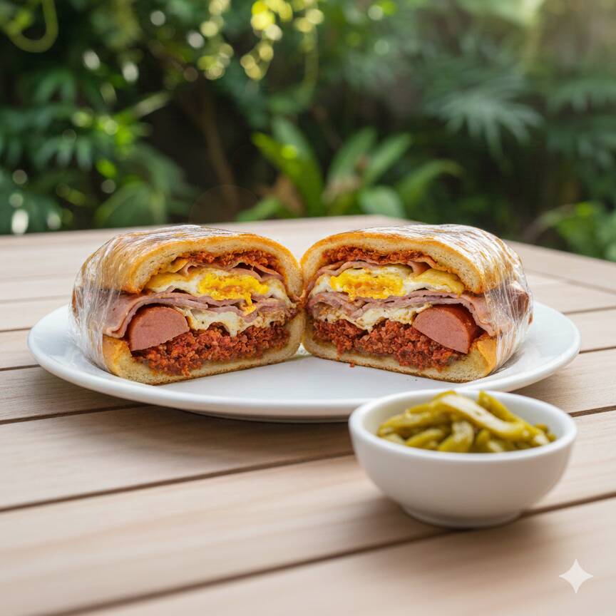 Milanesa de puerco, salchicha, pierna, quesillo, queso amarillo, chorizo, huevo, jamón, mayonesa, frijoles, jitomate, cebolla, aguacate y picante a elegir entre rajas o chipotle.