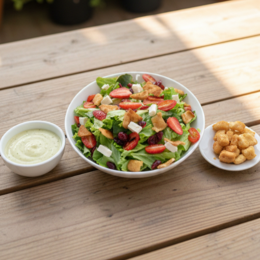 350 gr de ensalada (Lechuga, espinaca, fresa, jitomate cherry, pollo empanizado, queso panela, arándanos, complemento y aderezo a elegir).